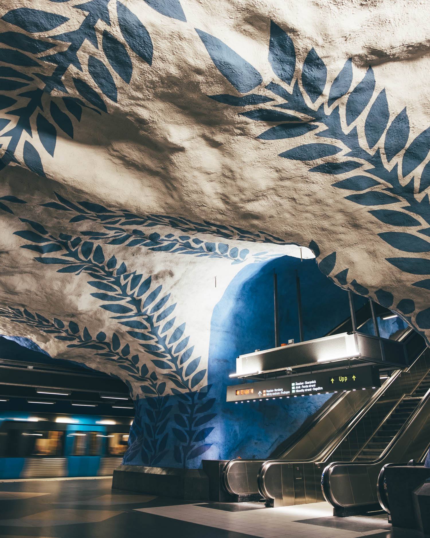 T-Centralen: Opened in 1957, the T-Centralen become the first station in Stockholm to feature artwork. Designed by local artist, Per Olof Ultvedt, it features beautiful blue vines climbing up the walls and pays homage to the workers who built the subway.