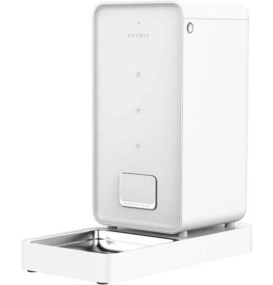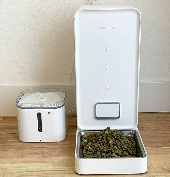 The whole tower is storage for the food — with a desiccant so it stays fresh for weeks. I schedule Bailey’s food to dispense automatically twice a day and I can control it from my phone via the app! Read my review about it here!