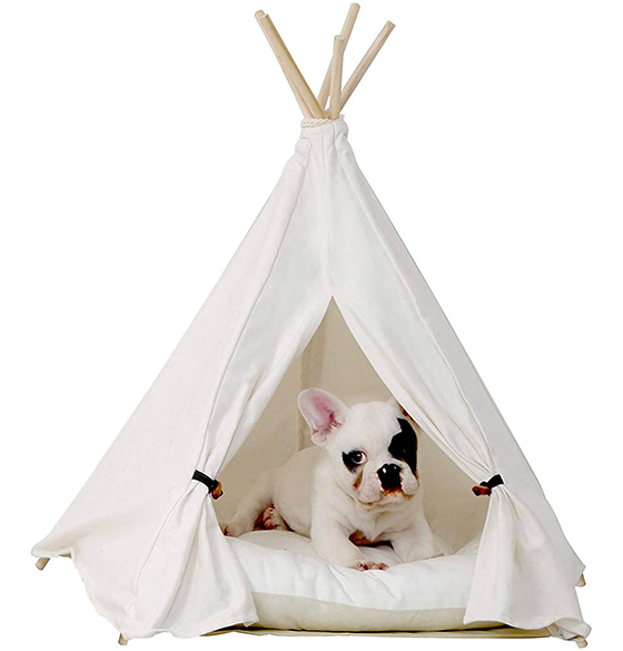 Made of durable cotton canvas (so it can be washed easily!), this canvas tent with pine wooden poles is the cutest little house for your pupper!