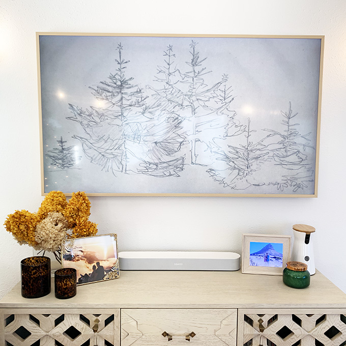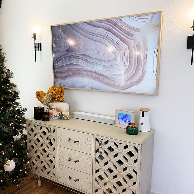 I am obsessed with our 65″ Samsung Frame TV! I loved it when we got it and I still love it months later. We’re always switching up the art, and for the holidays, we were able to make it festive. It truly looks like a work of art, especially since we paired it with the light wood frame.
