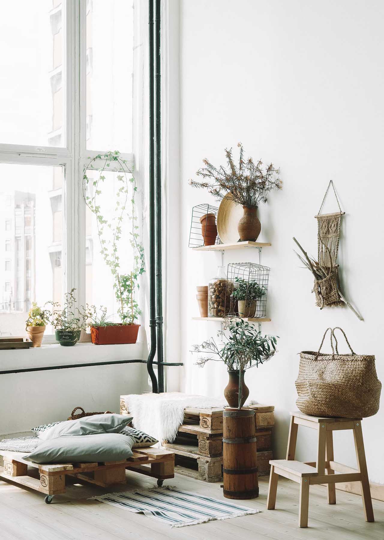 Think raw wood, rattan chairs, natural fibers (wicker, hemp, jute), add in beachy baskets or lampshades, stone or clay pots, and focus on natural colors and hues that are calming for you.
