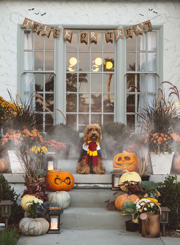 I decorated the stairs with two types of potted mums and potted Firecracker Dahlias from Home Depot. The porch is finished off with four solar lanterns for the evening and a cute “Trick or Treat” banner hanging from the pergola.