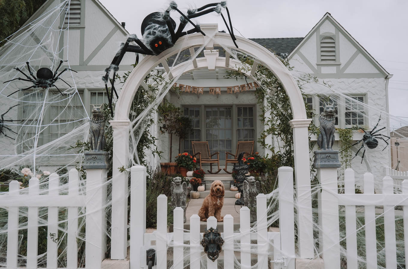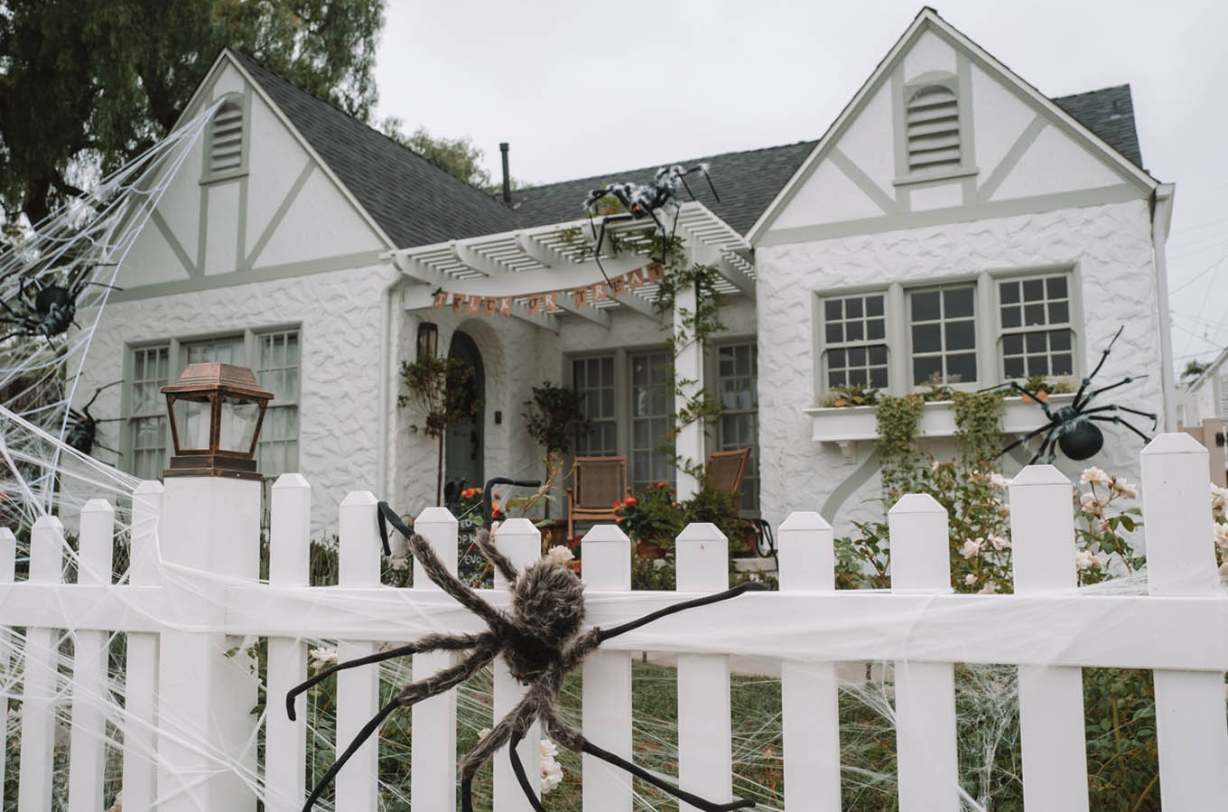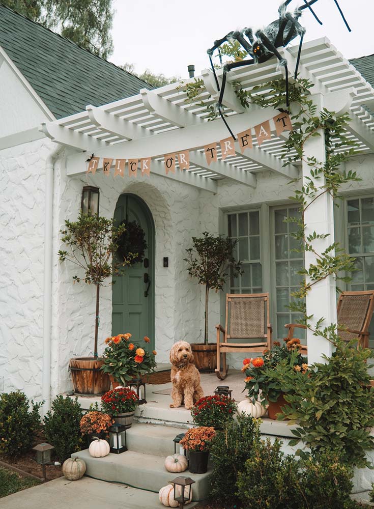 As soon as September comes around, I love to decorate my front porch with cozy fall décor. And then, as we began to shift toward October, it’s ON. We’re talking about a full pet cemetery, a spooky tree, a projector playing creepy videos onto our curtains, and lots of giant spiders.