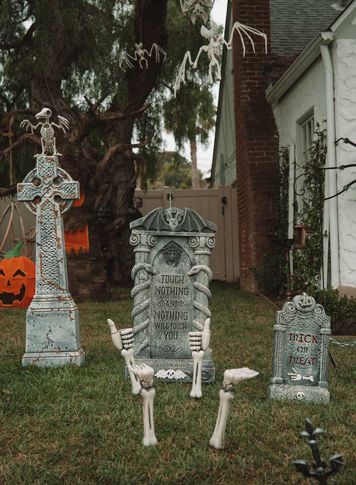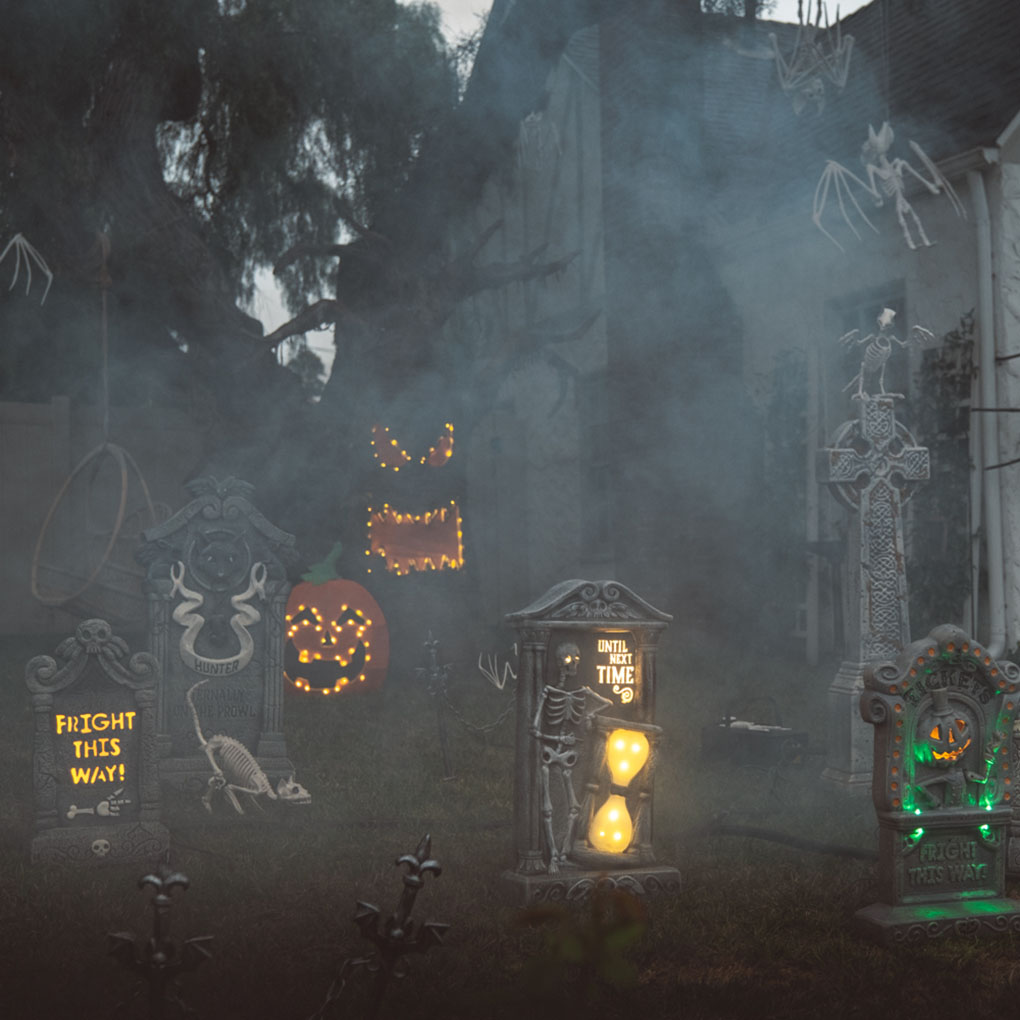 - Cemetery: The light-up decorations are all connected using a 4-outlet outdoor smart plug. 3 tombstones go into one outlet and another 3 tombstones go into a second outlet.