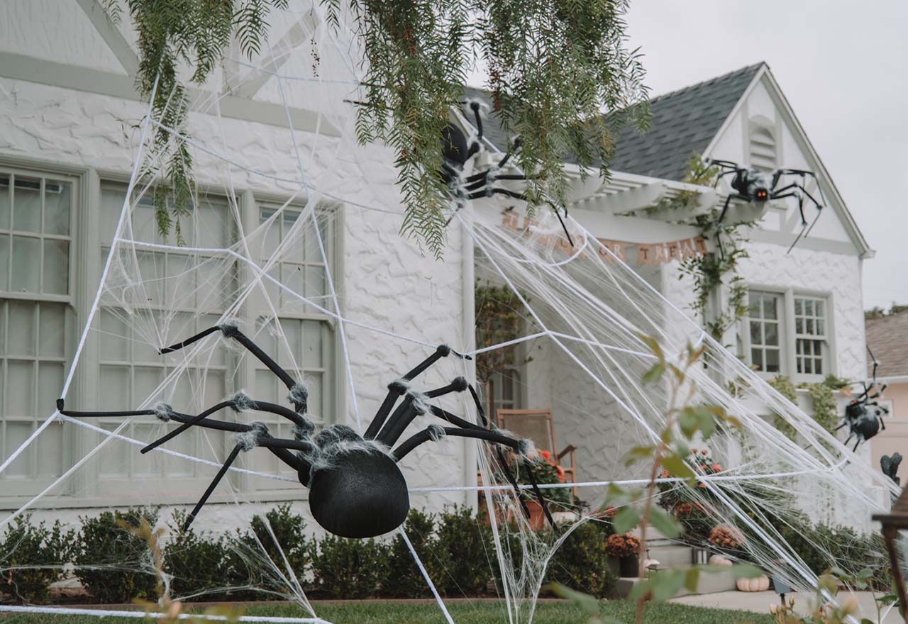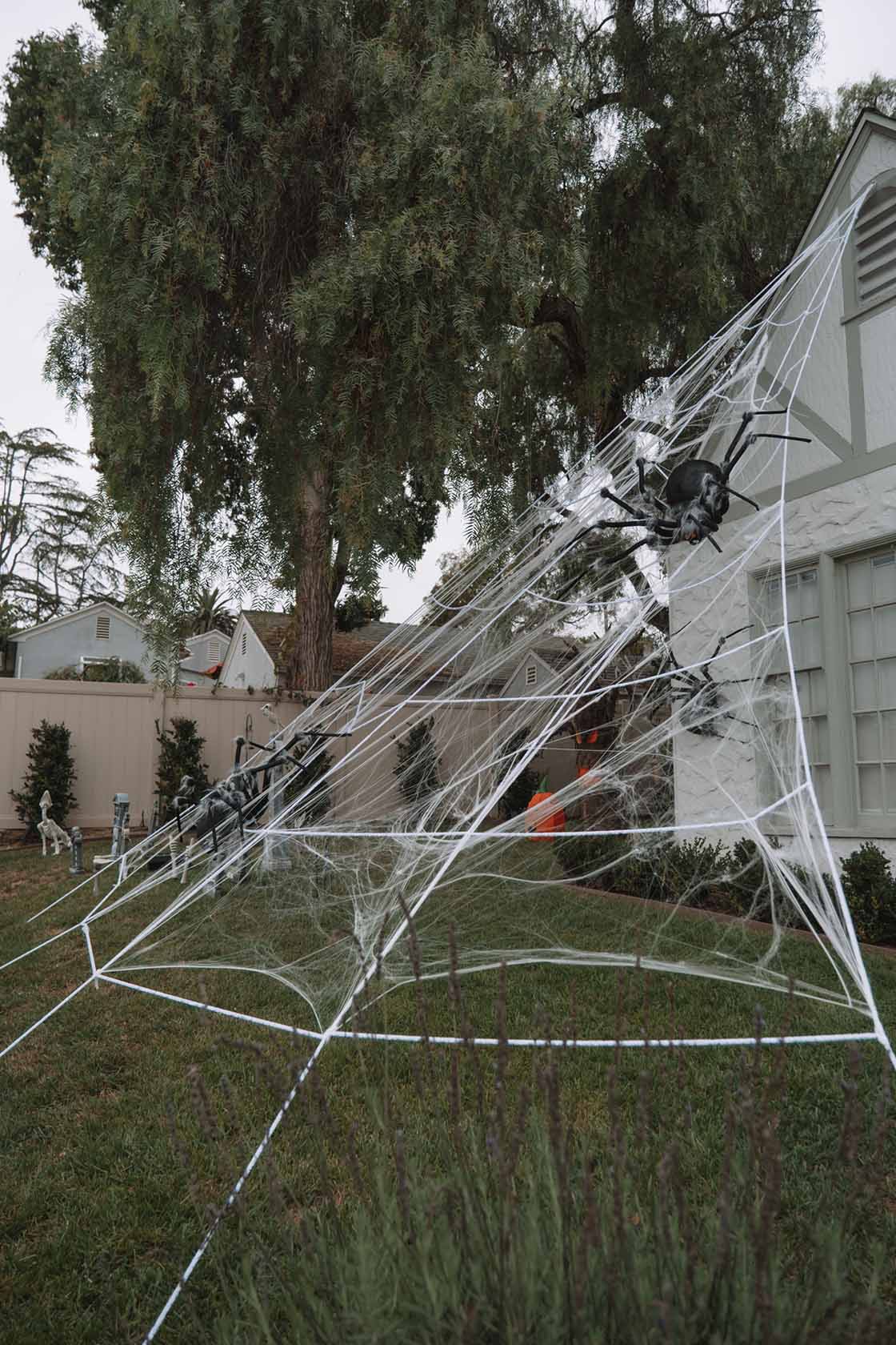 - Giant Spider Web — We screwed a hook into the eaves of our home to have a hold point so just be mindful of how you plan to attach the top to your house. It has a lot of tension so I don’t think an adhesive hook would hold up. The web came with stakes to put into the grass to mount the bottom.