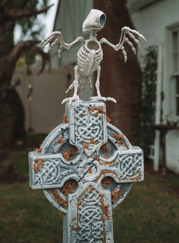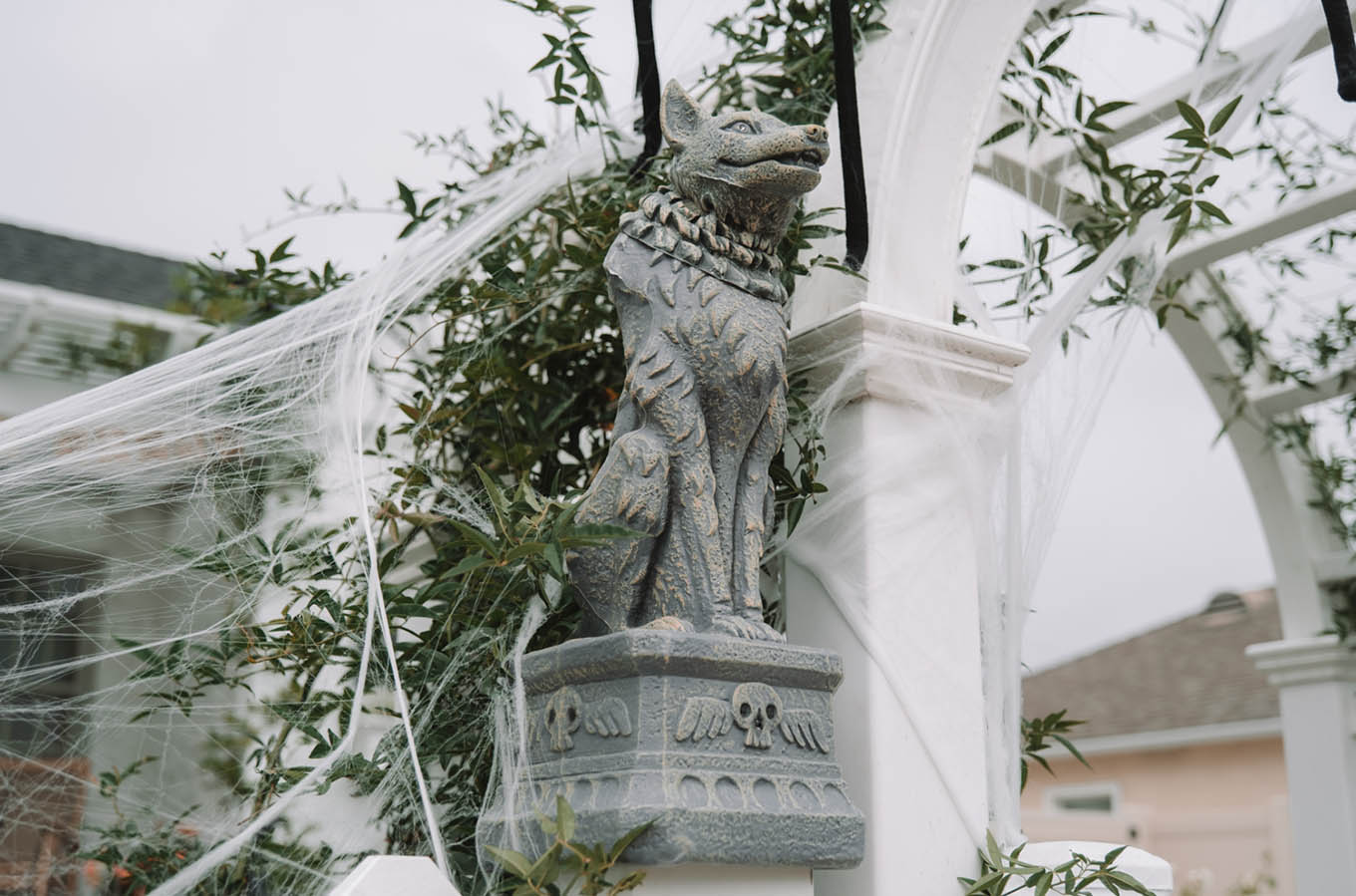 On the pathway, we added two gargoyles and a spooky pathway sign to fill the space between the front gate and the porch.
