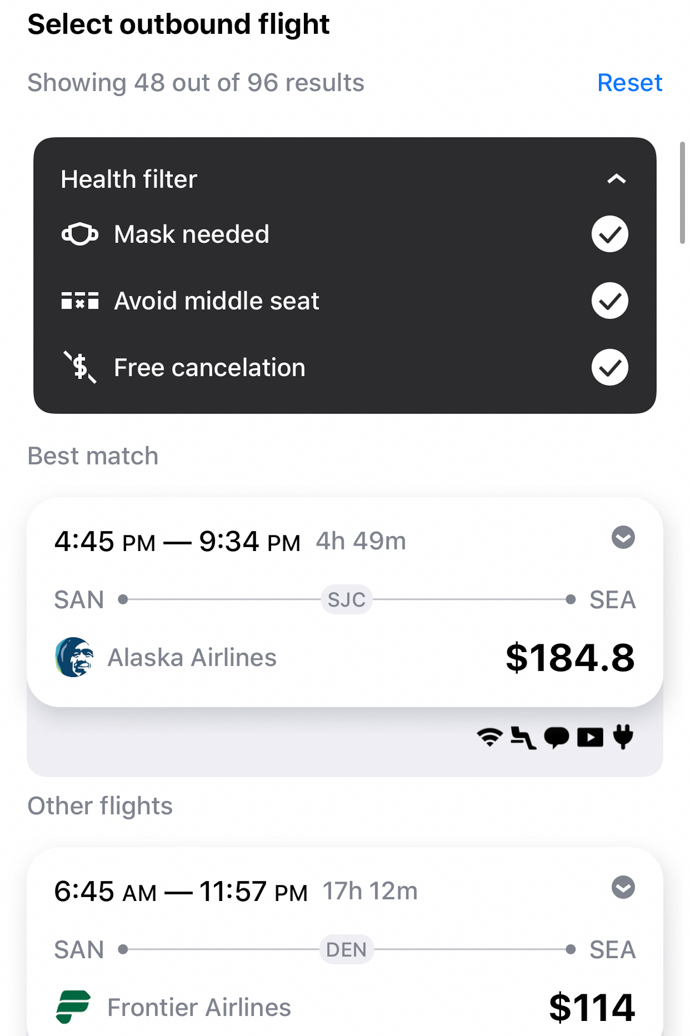 If I search using those filters, I can see that Alaska Airlines is avoiding booking middle seats, masks are required, and they offer free cancellations and changes at this time.