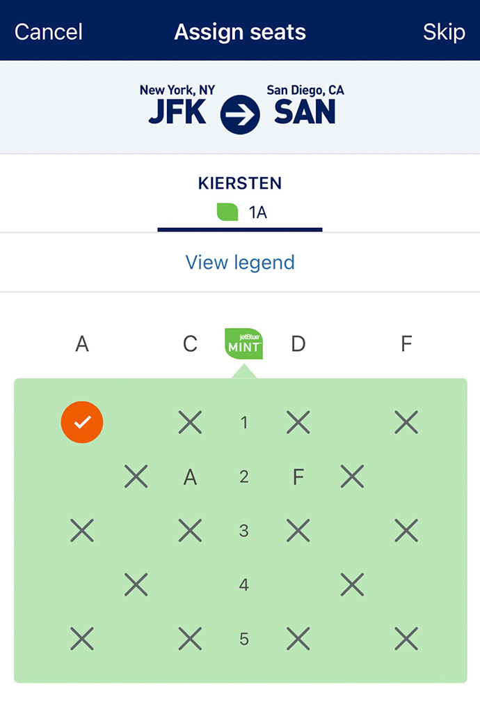 - Cabin & Layout: JetBlue Mint business class, 12-seats across 5 rows, alternating 1-2 and 2-1 configuration