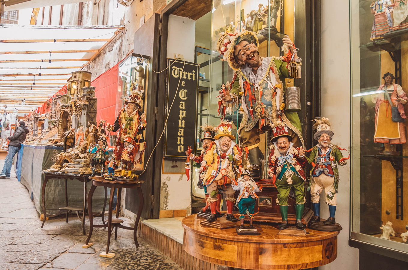 The carved wooden nativities are especially famous in Naples. It’s a tradition that’s been passed down through generations in these workshops. The alley is located at Via San Gregorio Armeno.