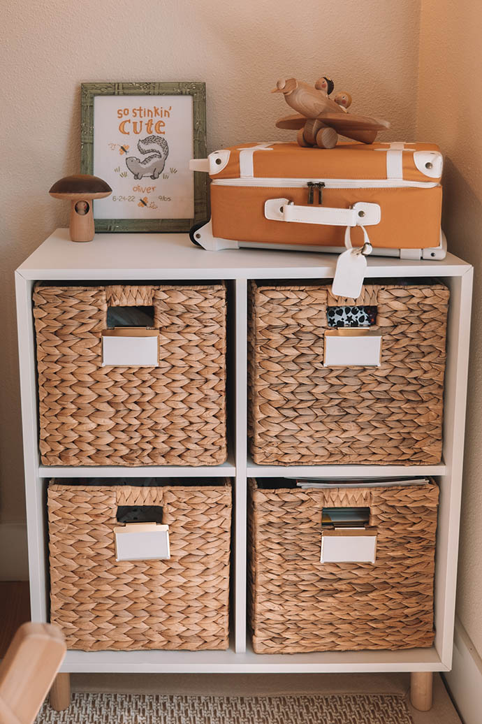 We also store things under the dresser and under the crib; plus, we found storage solutions for toys while keeping “stuff” to a minimum (as much as possible).