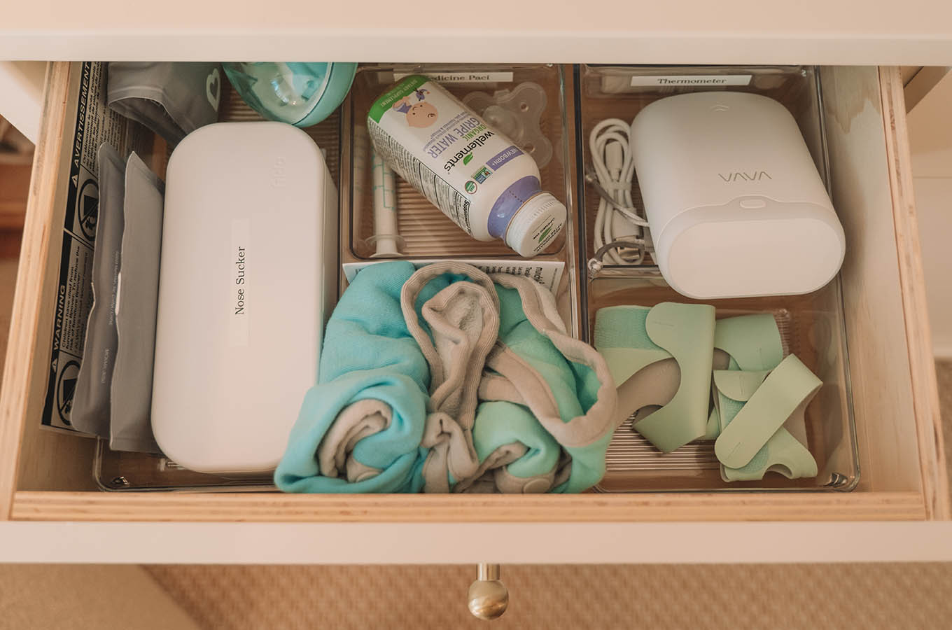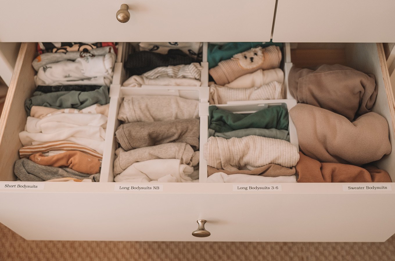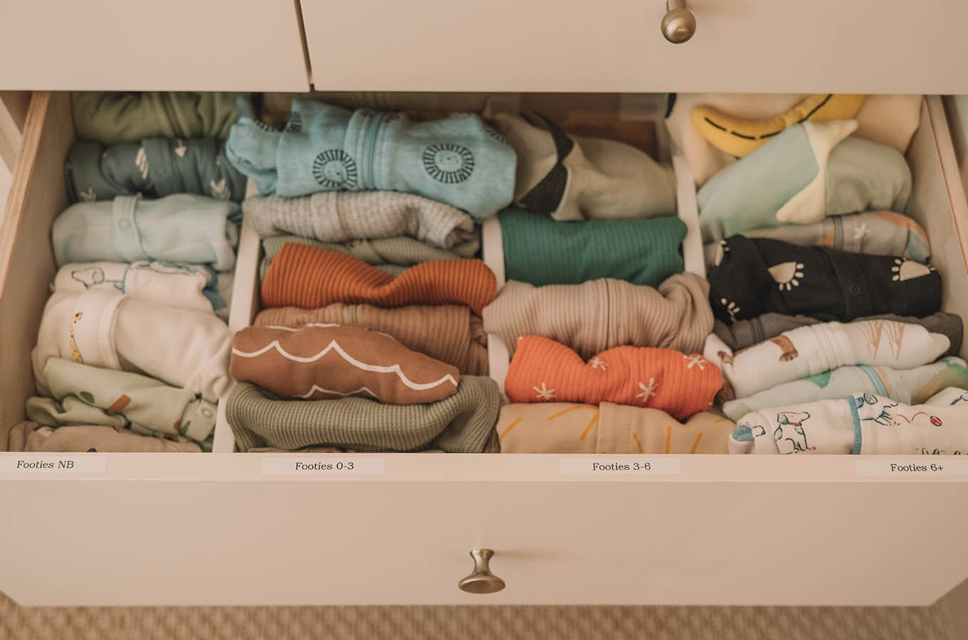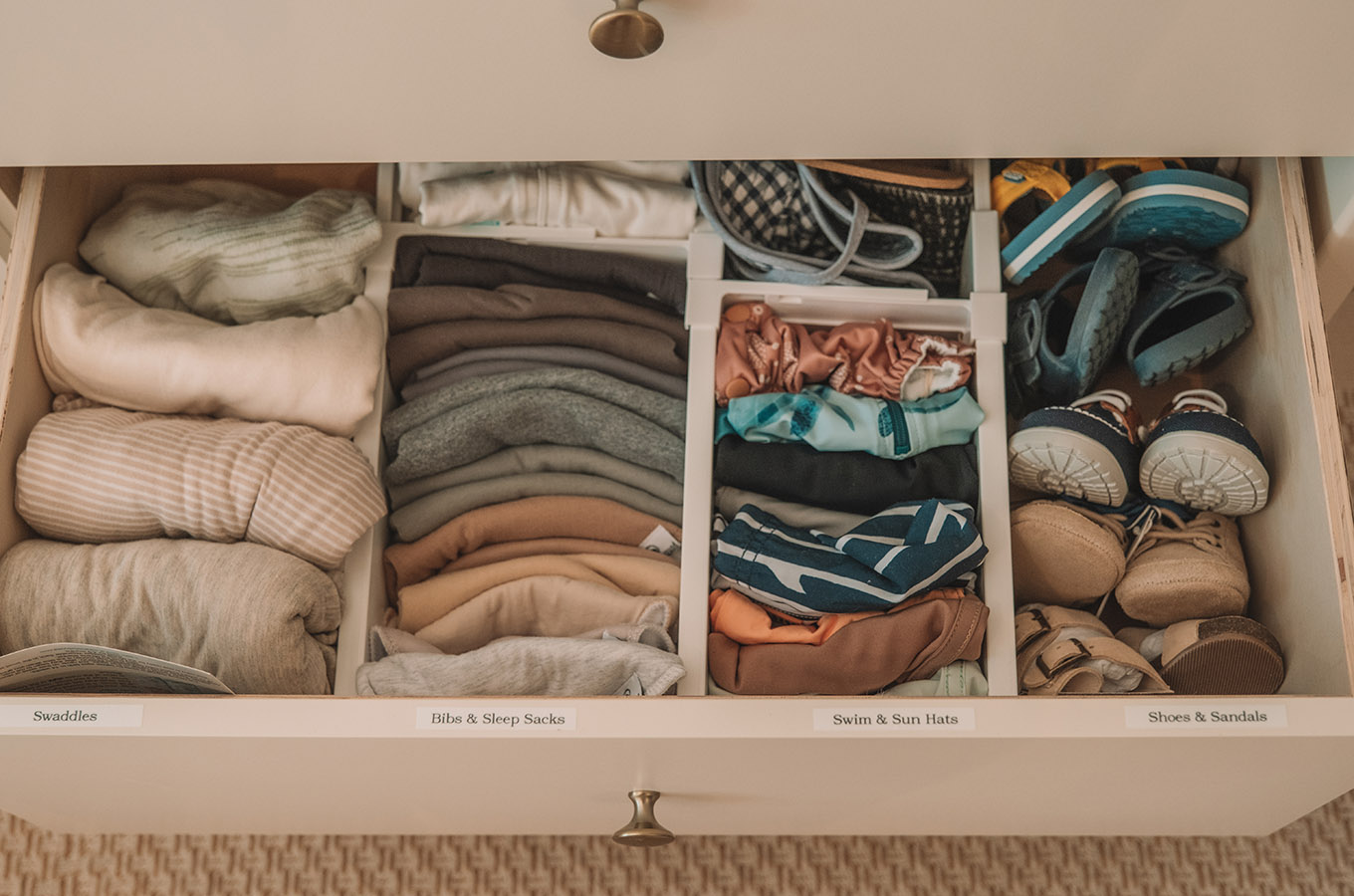 - Bottom Right 1/2 Drawer: Swaddles, drool bandanas + sleep sacks, swim + sun hats, baby shoes