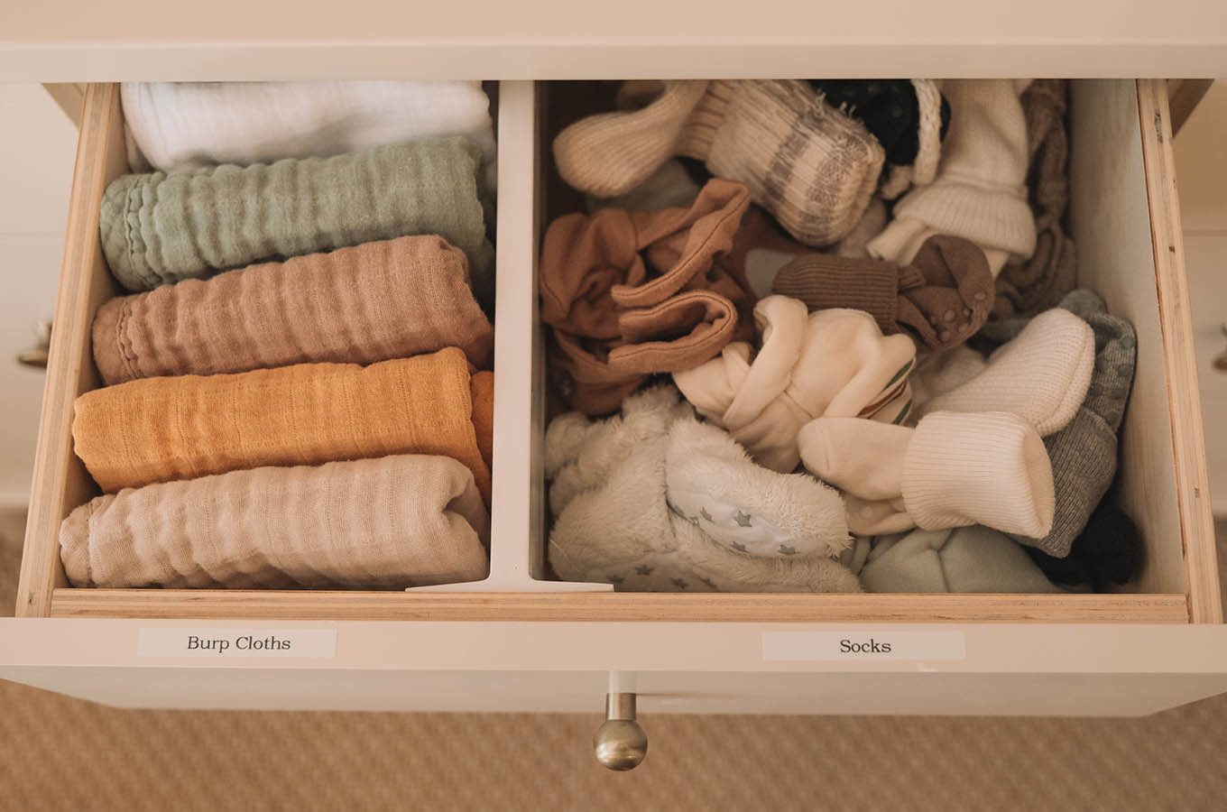 - Top Middle 1/3 Drawer: Burp Cloths + Socks