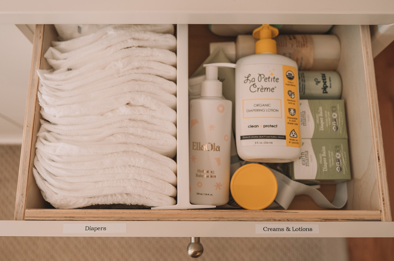 - Top Right 1/3 Drawer: Diapers + Creams & Lotions