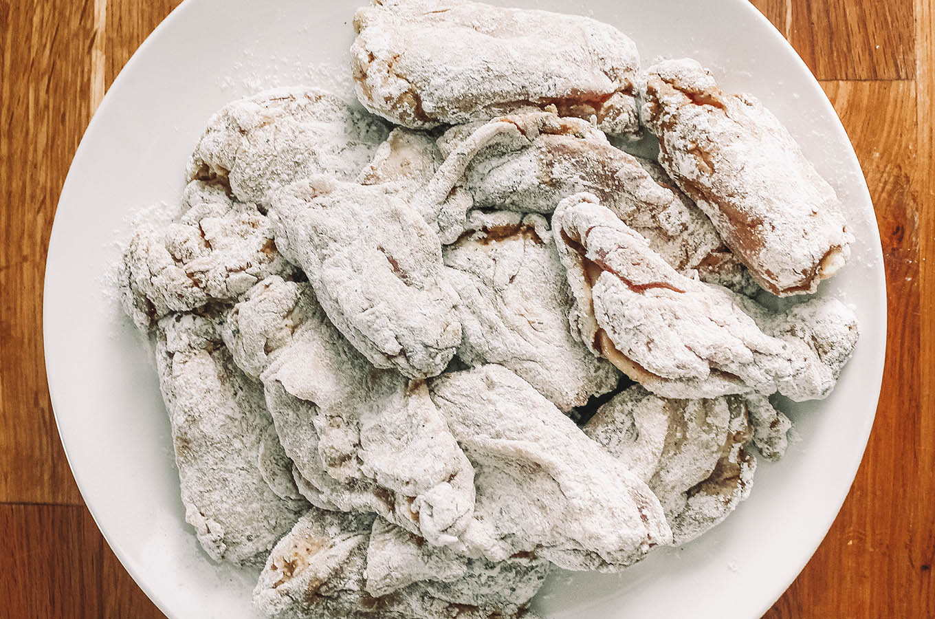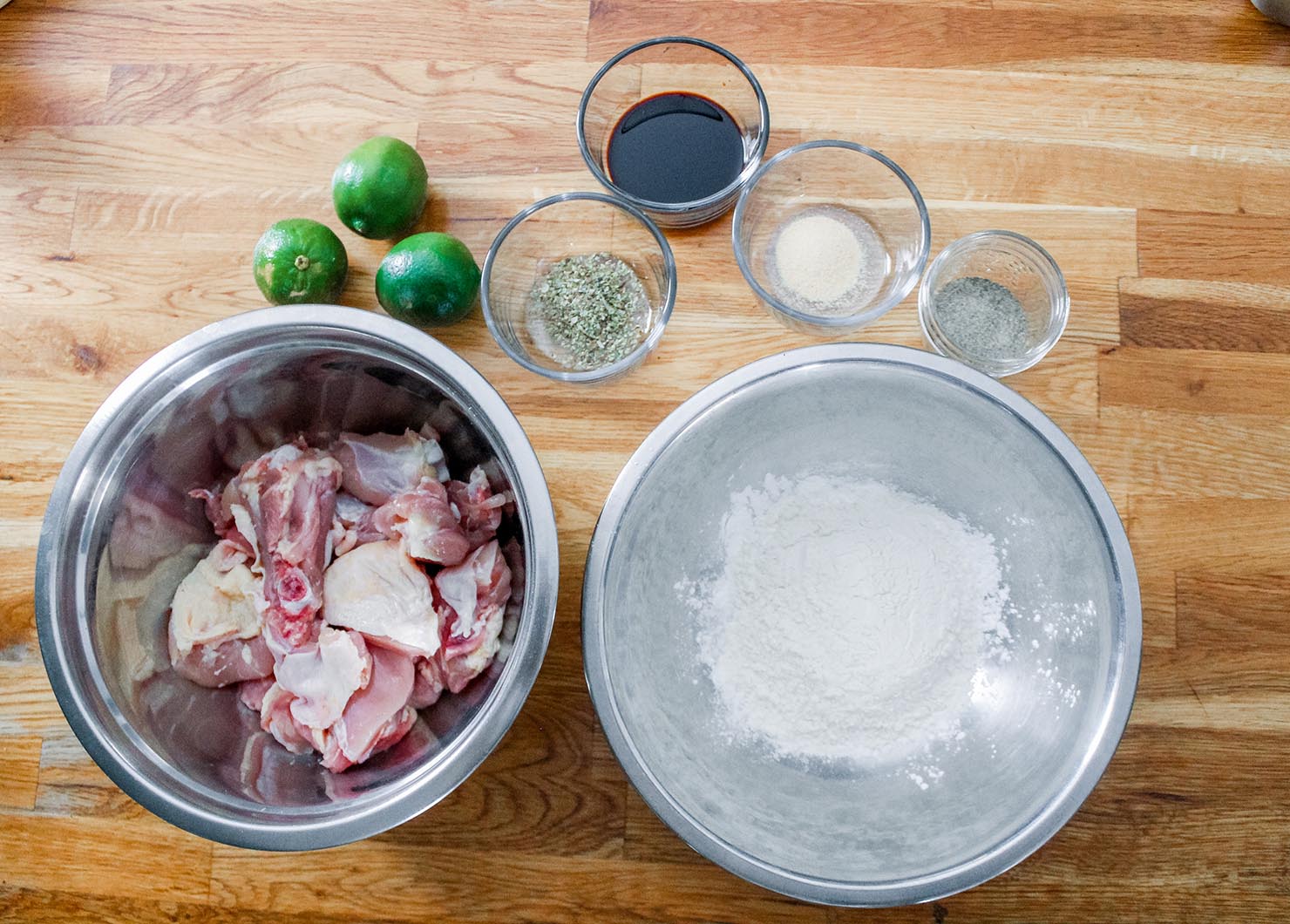 - 2 limes sliced into wedges (one lime to season the chicken, the second lime for garnish and drizzle on fried chicken)