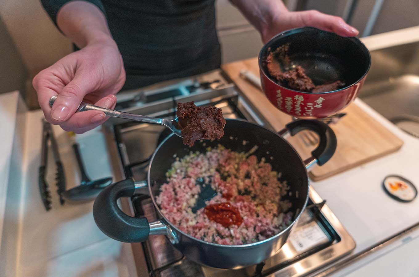 - To make the base for your ramen soup, pour one tablespoon of sesame oil in a pot and turn on medium heat. Add grated garlic, ginger, finely cut shallot (or leek), miso paste, and Doubanjiang to the pot and mix well.