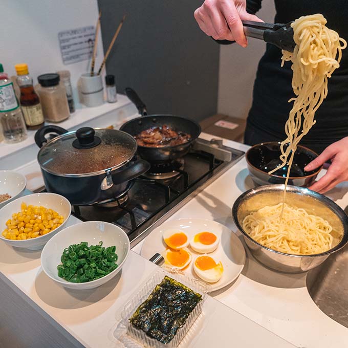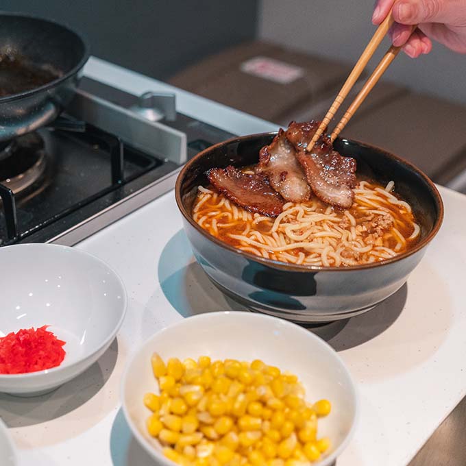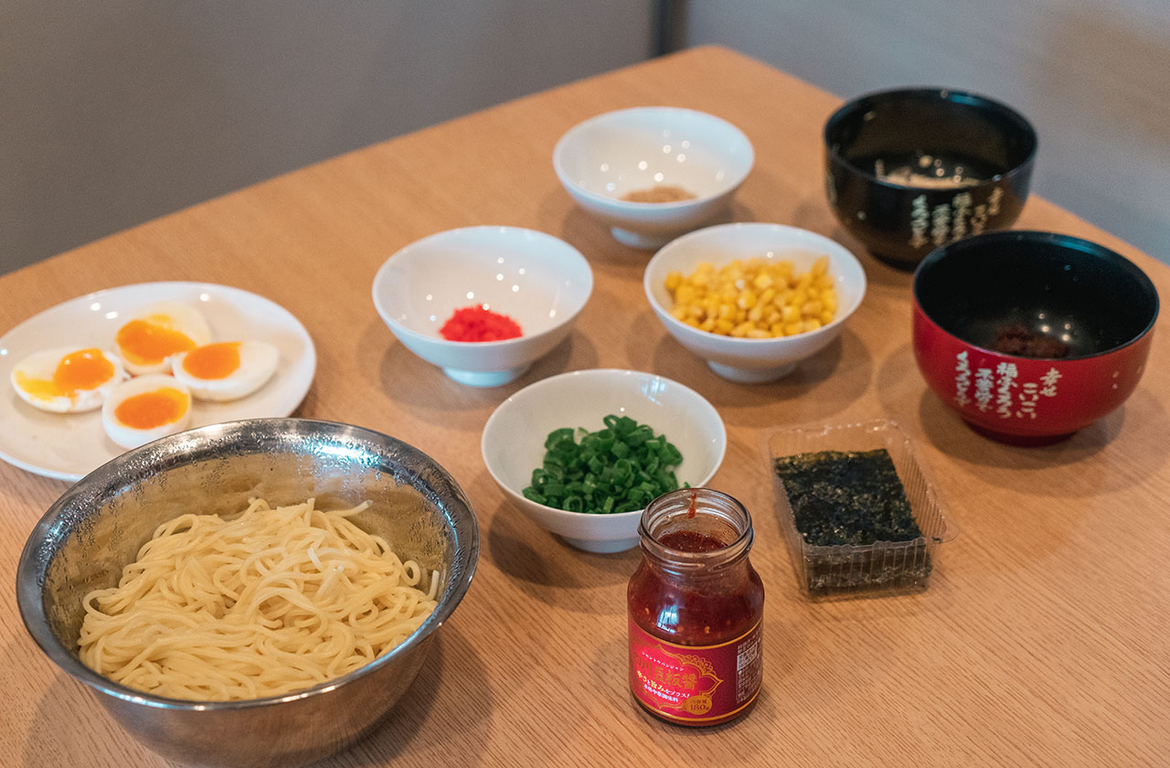First, you put some noodles in your bowl, then you add soup and style the toppings of your choice.
