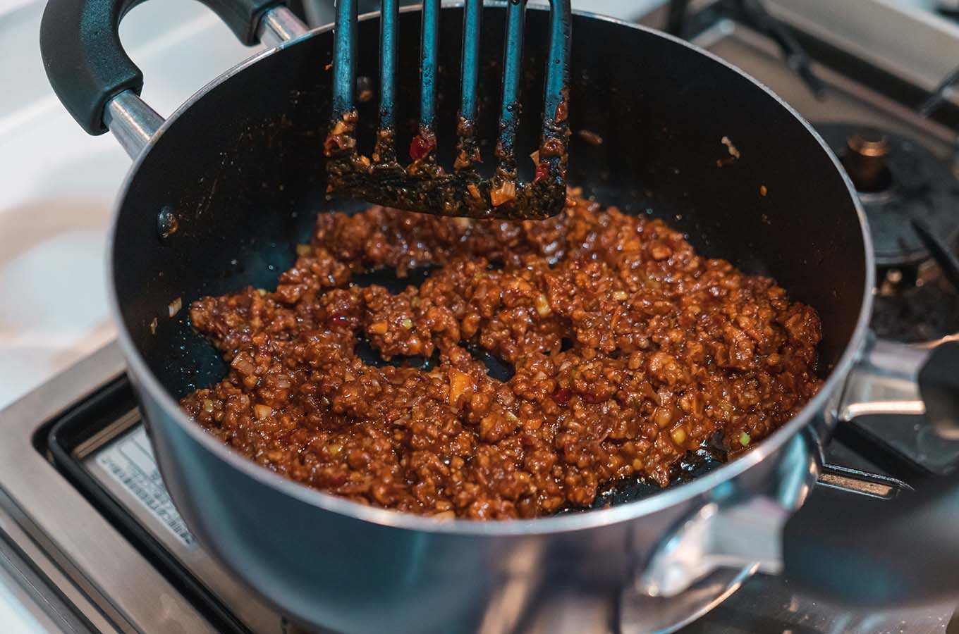 - Add ground pork and cook until the meat is cooked through (about 5 – 8 minutes).
