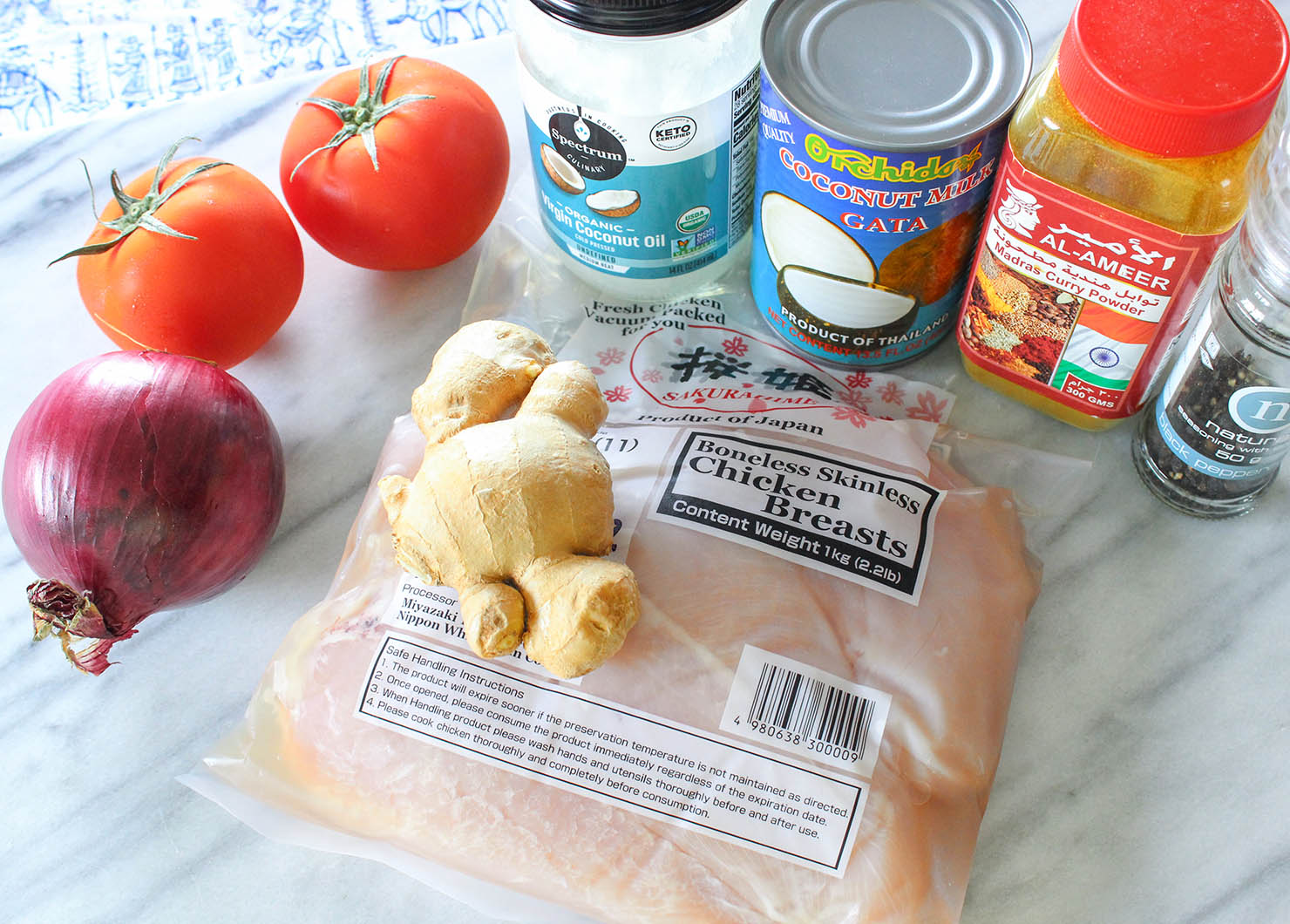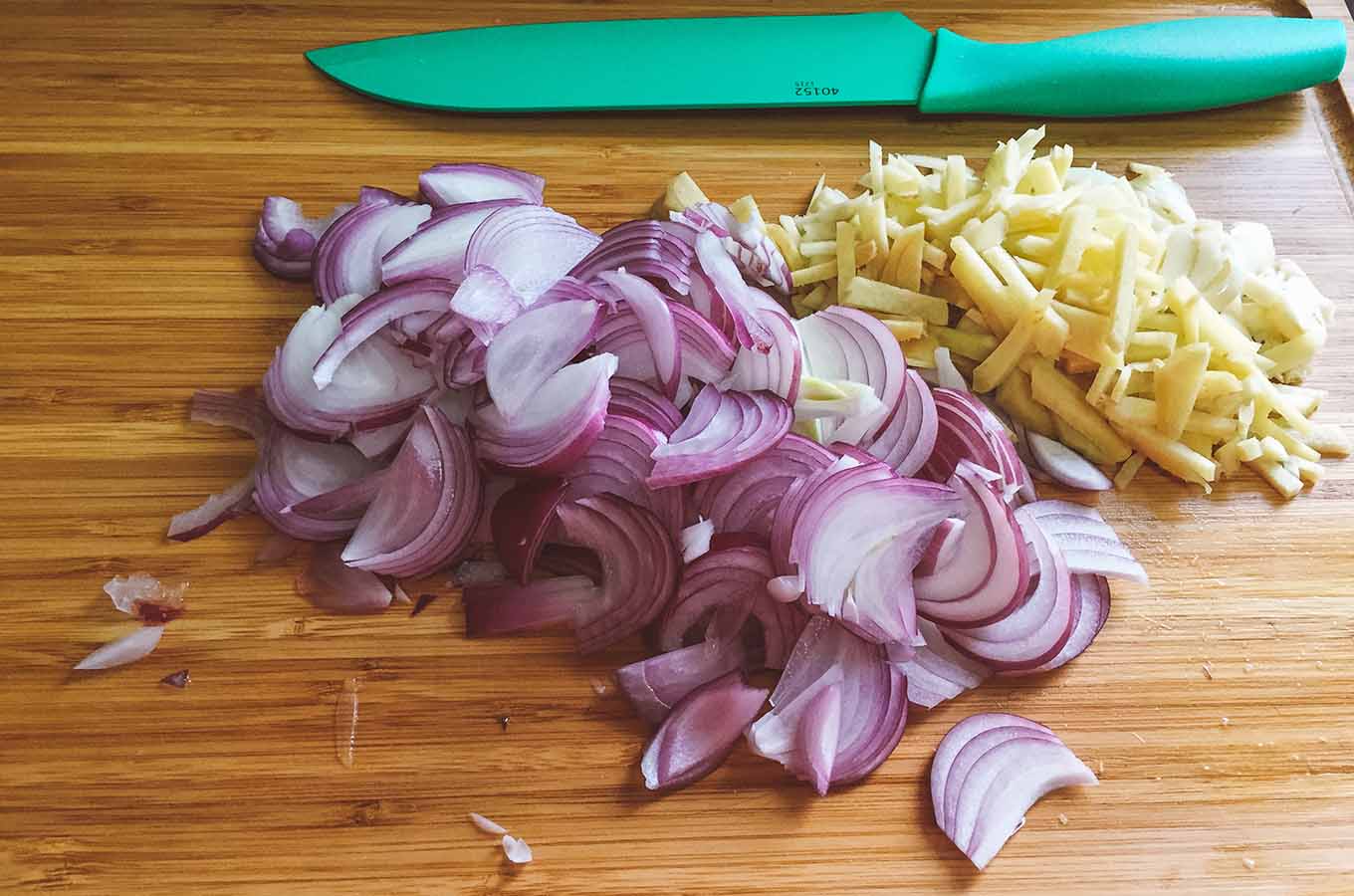 - Peel and slice the ginger, and smash and chop the garlic cloves. Slice the red onion into thin slices. Chop the tomatoes and chicken into roughly 2-inch pieces.