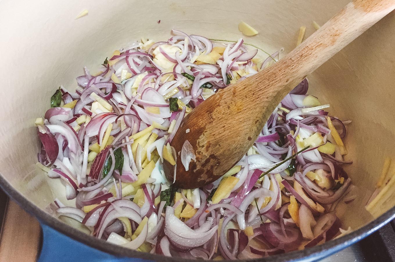 - Put the coconut oil or ghee into a large heavy pot and melt over medium heat. Add the curry leaves and cook for a minute, then add onion, garlic, ginger, and a little salt, and cook until starting to brown, stirring occasionally.