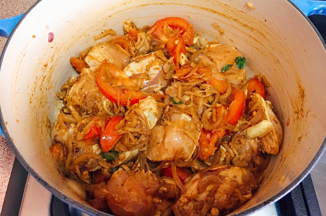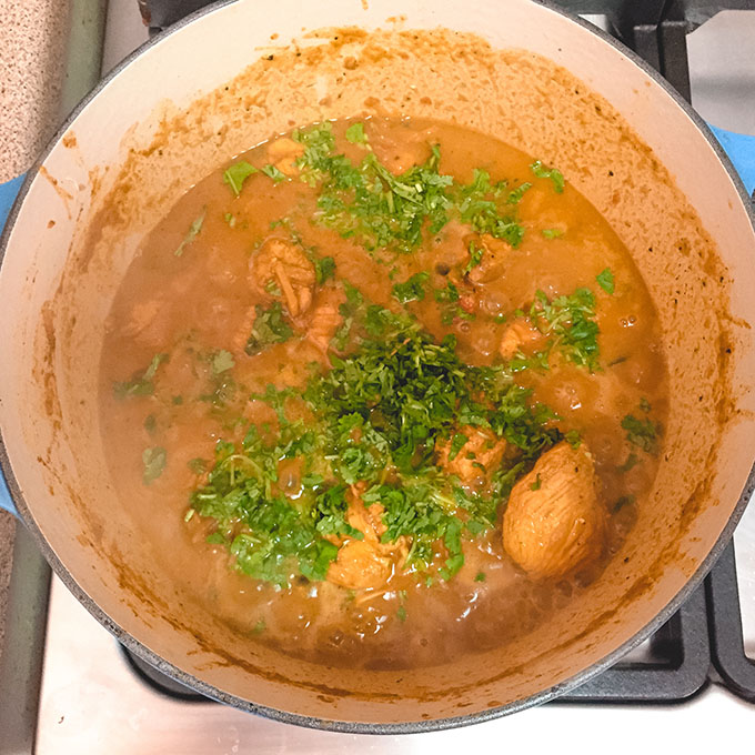 - Once the onions have started to brown, add the curry powder and ½ teaspoon of black pepper, then stir in the chicken and tomatoes. Cover the pot and cook for 10 minutes, then stir the mixture and cook an additional 10 minutes uncovered. While it’s cooking, rinse and finely chop the cilantro.