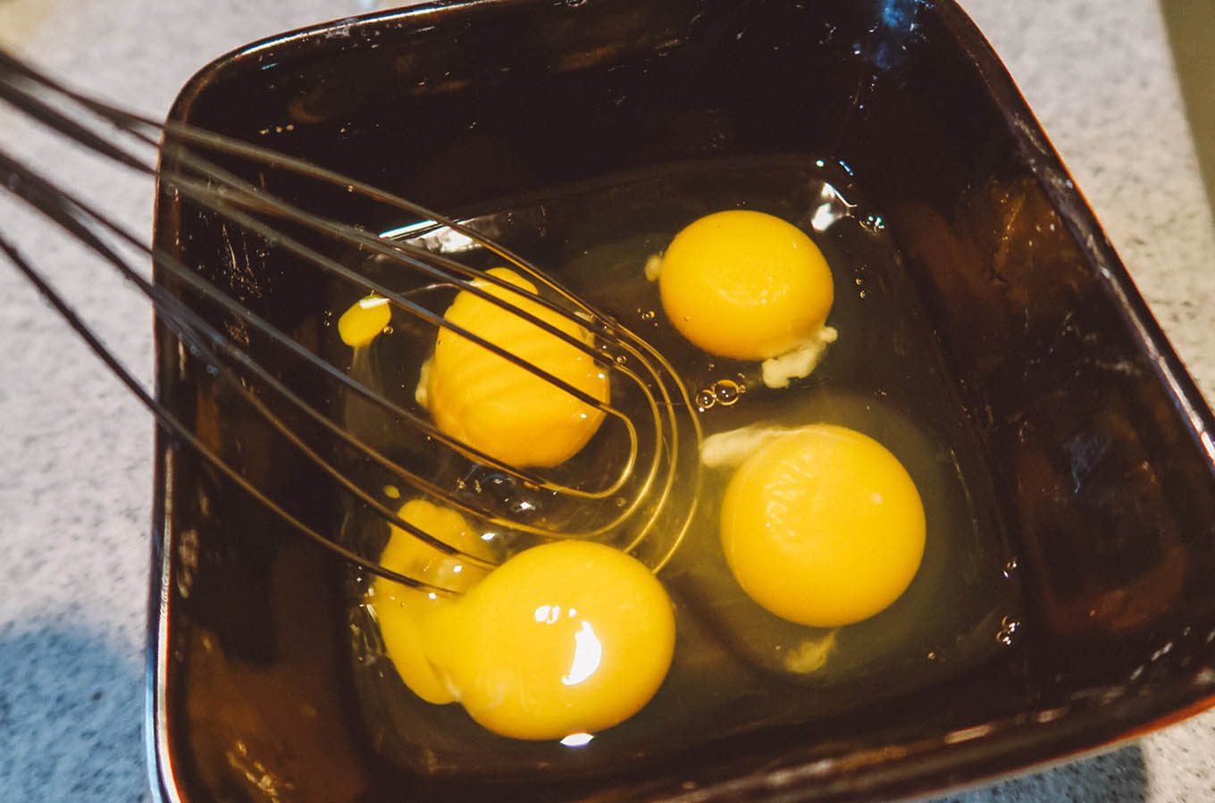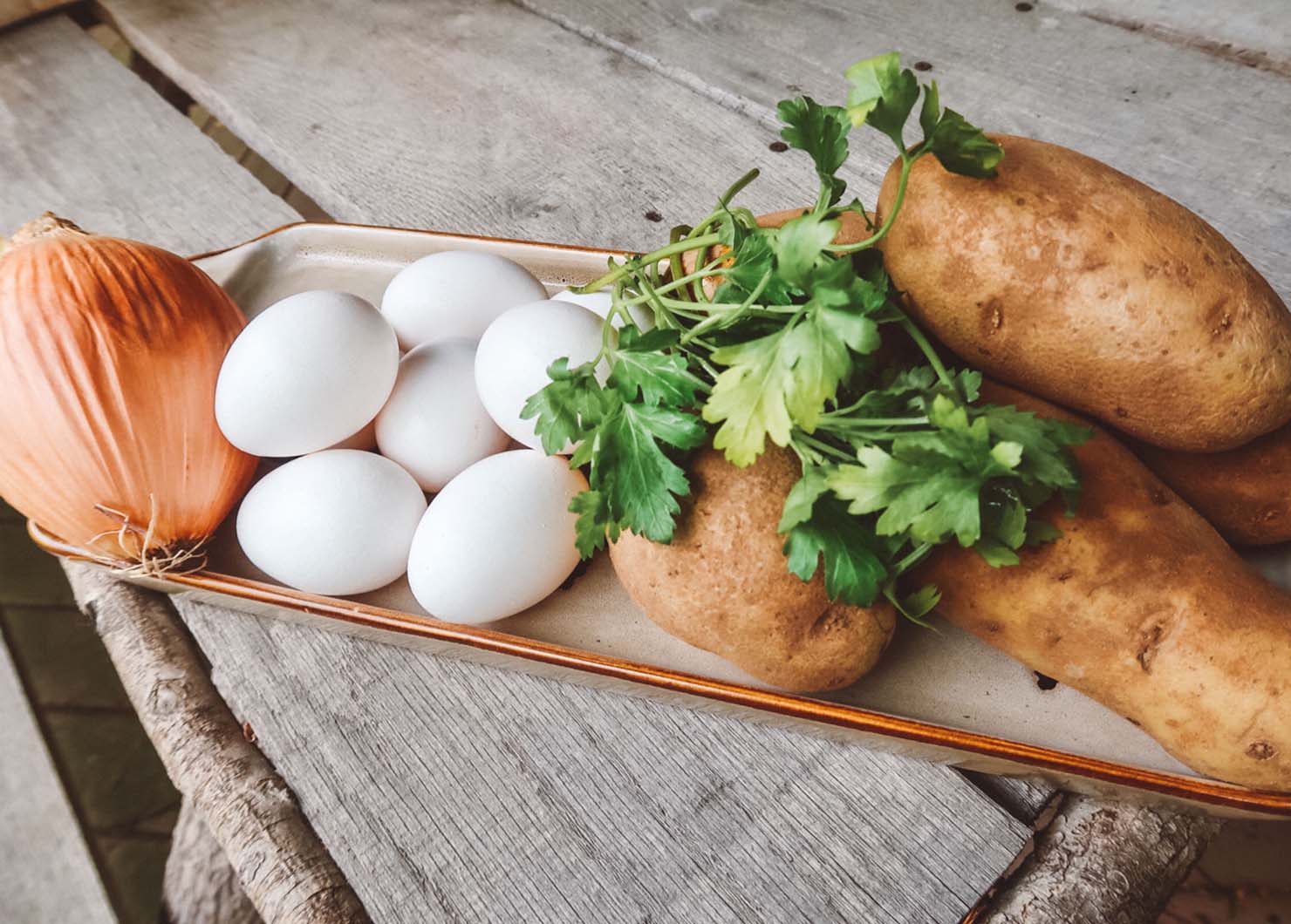 - Beat eggs with a pinch of salt and pepper. Pour egg mixture into the pan, moving it around the potatoes and onions.