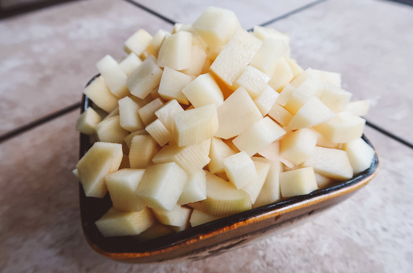- Peel the potatoes and dice into 1-inch pieces. Peel and chop the onion.