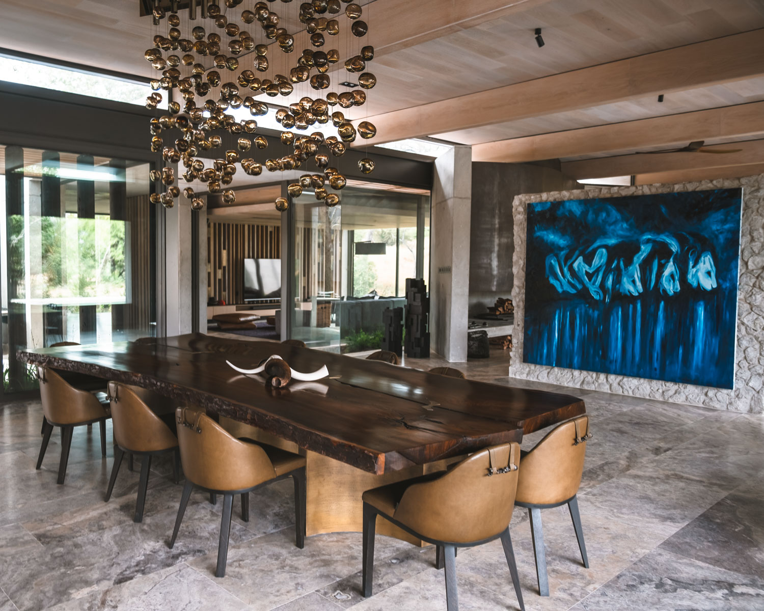 Every detail of the interior has also been thought through, down to custom-designed furnishings and decor by South African artisans and craftspeople. While keeping the design minimal and entirely open, they’ve focused on showcasing nature along with original artwork and beautiful furnishings.