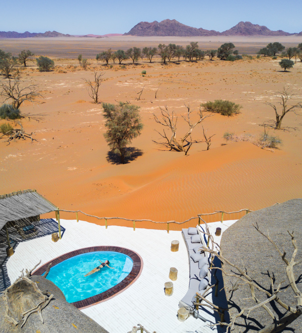 The rooms at Little Kulala are inspired by Deadvlei. Each of the 11 thatched “kulalas” come with a private plunge pool that overlooks the beautiful desert plains.