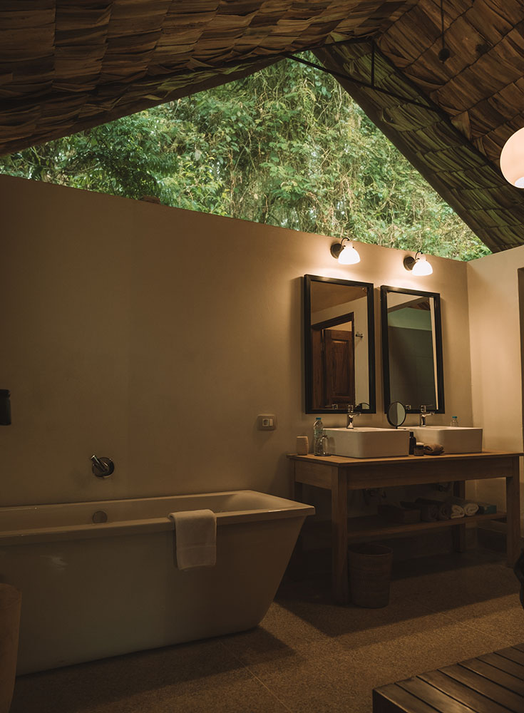 The permanent tents are newly renovated with extremely comfortable mattresses, mosquito nets around the bed, full-size tubs, a double sink, a private shower and more.
