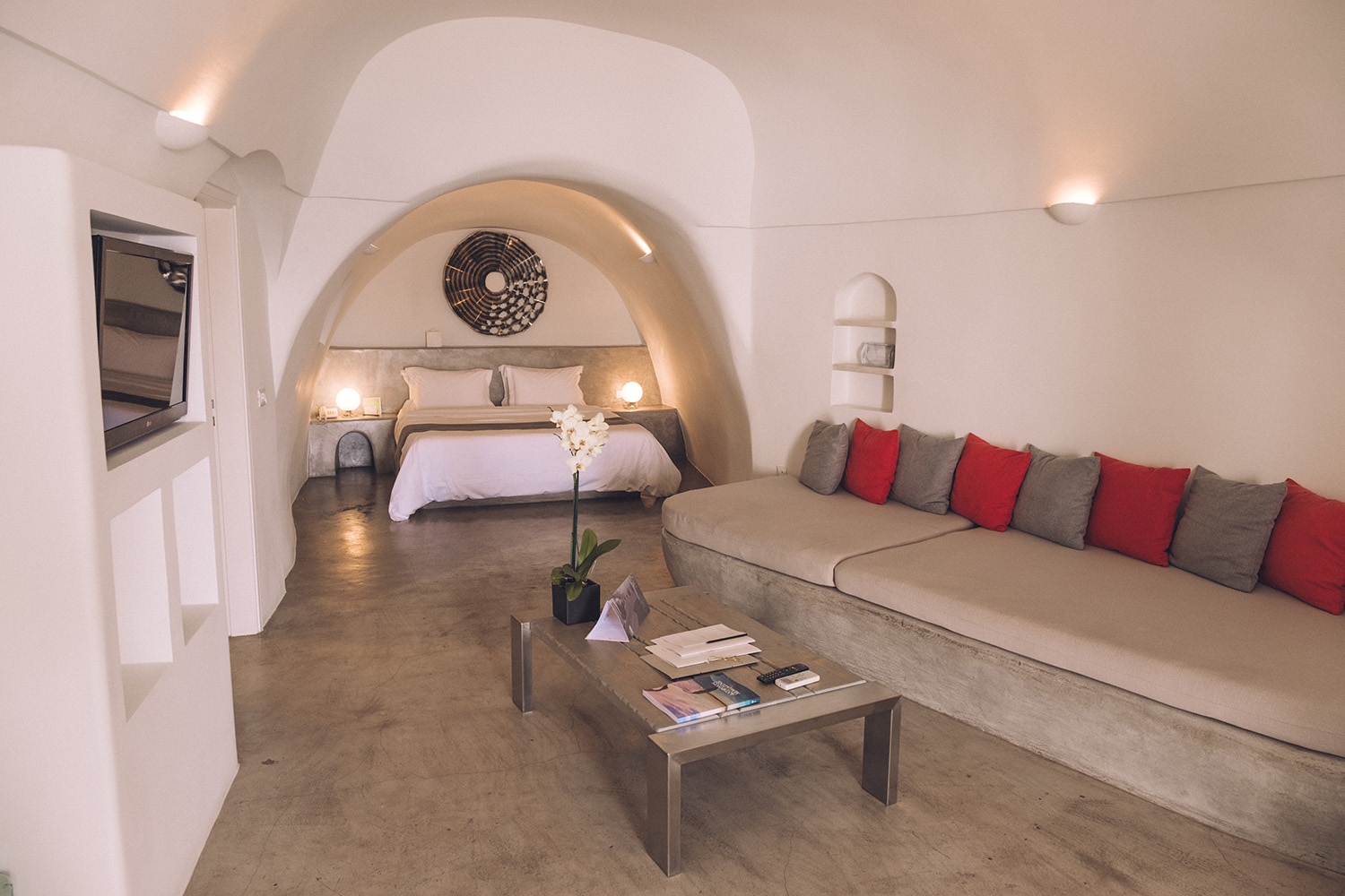 The 23 cave-like suites all have their own private entrance, living rooms, secluded balconies with sweeping views, king-sized beds, walk-in rain showers, and a private jacuzzi. I was especially fond of the aesthetic—crisp white walls and minimalistic décor.
