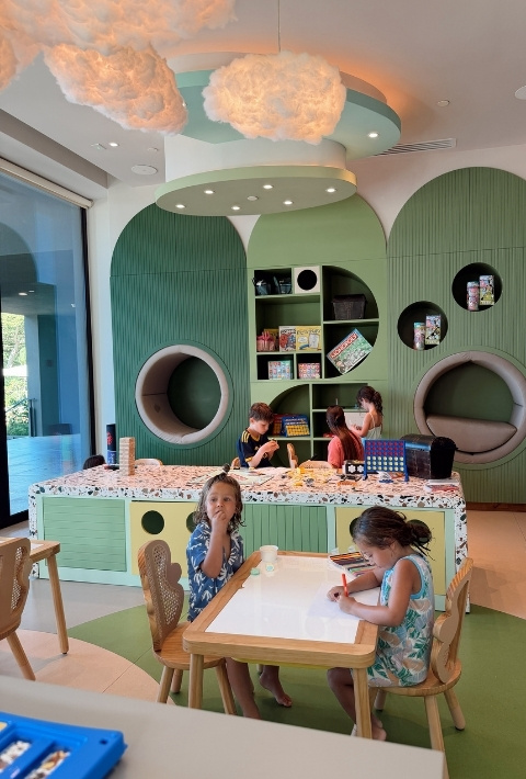 The Kids Club runs from 9 am to 5 pm for ages 4 to 12 and has indoor play spaces with crafts, toys, dress-ups, and playdough, plus a small outdoor playground and shallow pools that work well for little ones.