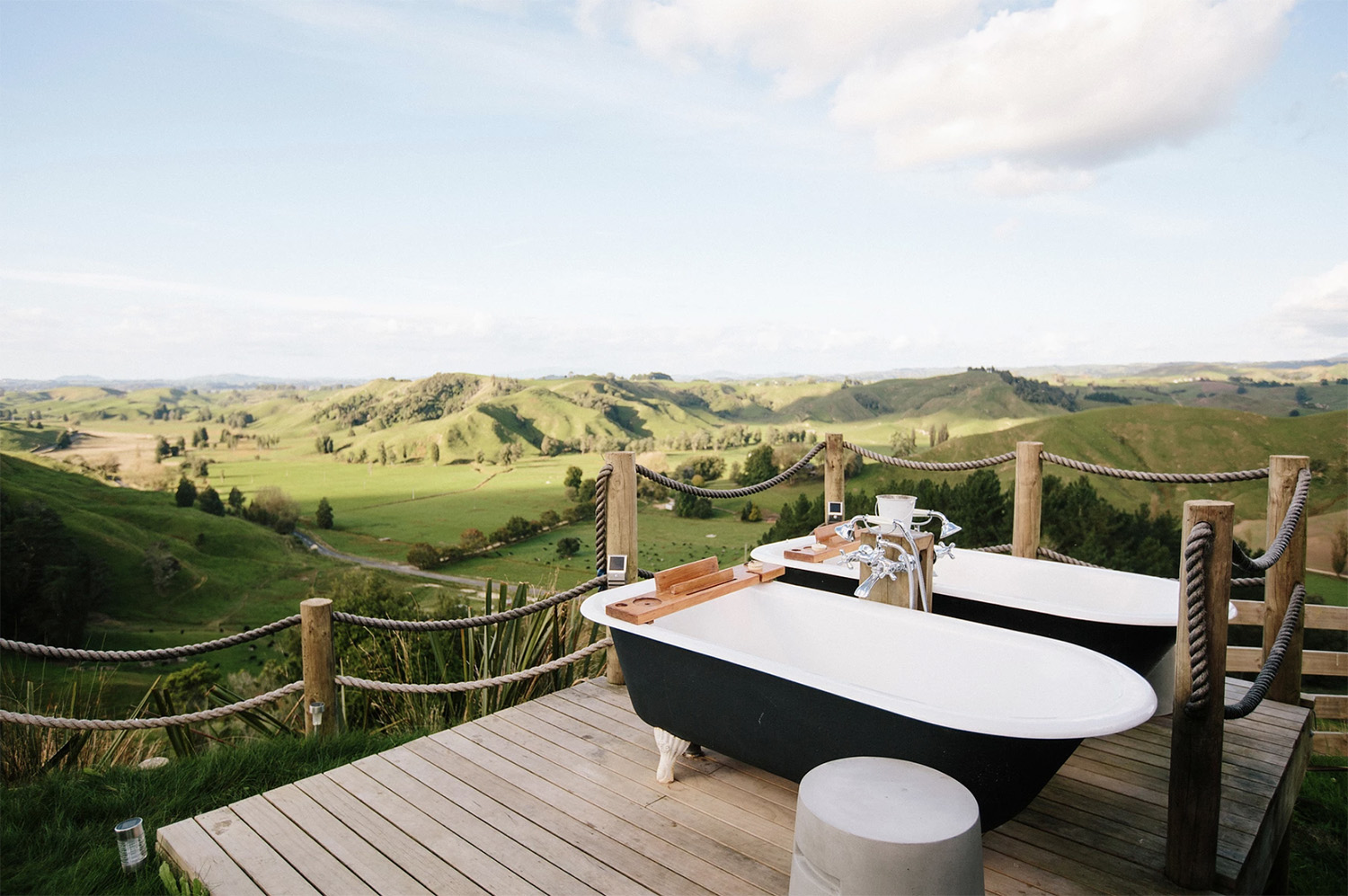 With panoramic views of the New Zealand farmland, the Waitomo Hilltop takes glamping to a whole new level. The clawfoot tubs sit on a private wooden deck, overlooking the lush green hills. They’re the perfect place to end the night after making s’mores over your own firepit.