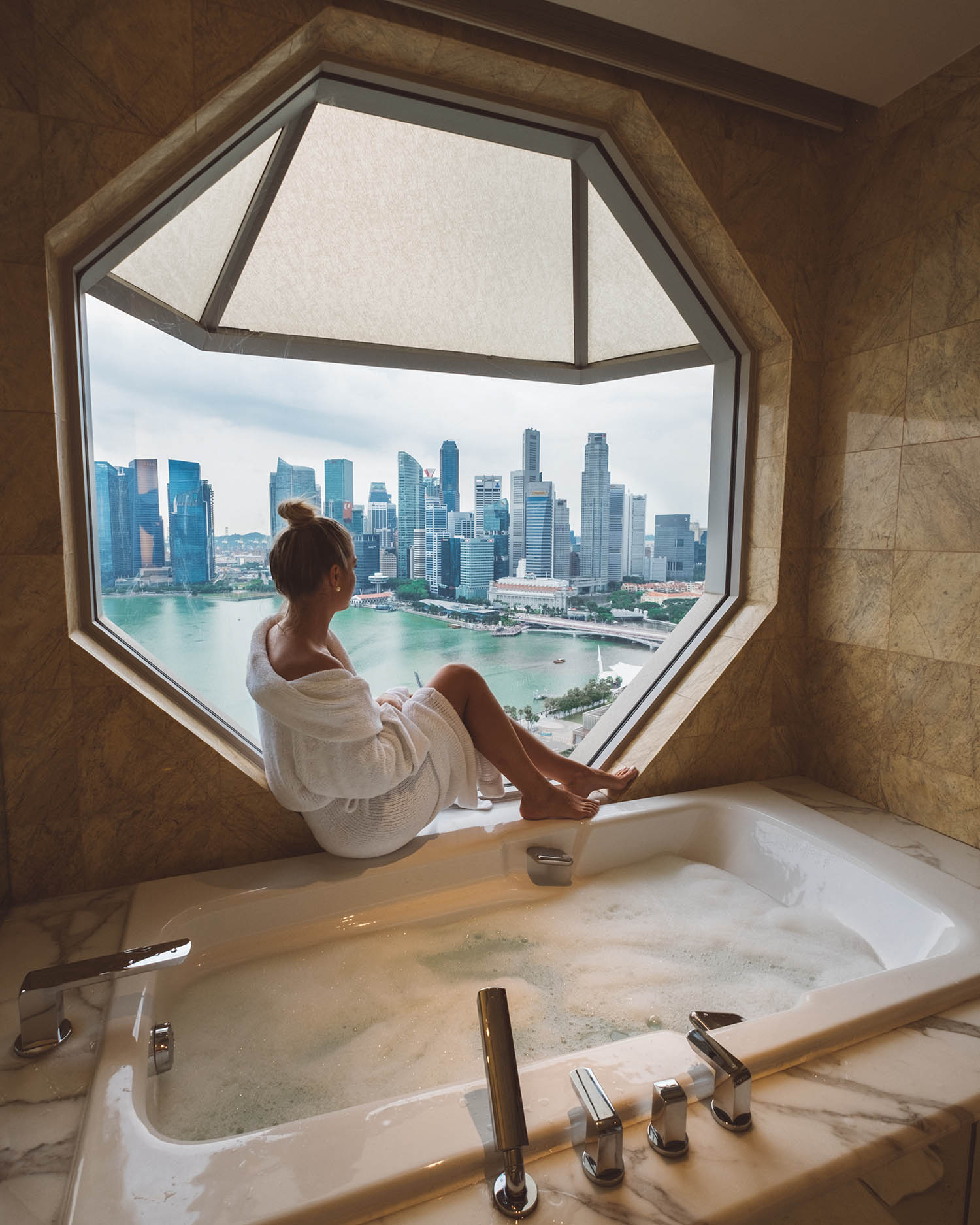 Not every incredible bath has to be outdoors. The Ritz-Carlton in Singapore, named the best hotel in Singapore by Travel & Leisure, has some of the best views from the bathtub. The fabulous marble bathroom offers sweeping views of the cityscape while making you feel as if you’ve been transported to a spa.