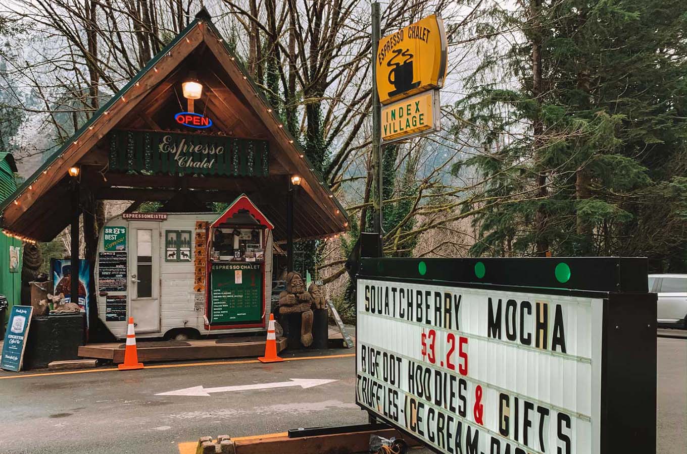 Part of the fun with road trips is finding hidden gems and places to stop at while you drive — while we were driving to Leavenworth, we stumbled across the cutest coffee chalets that were sooo good.