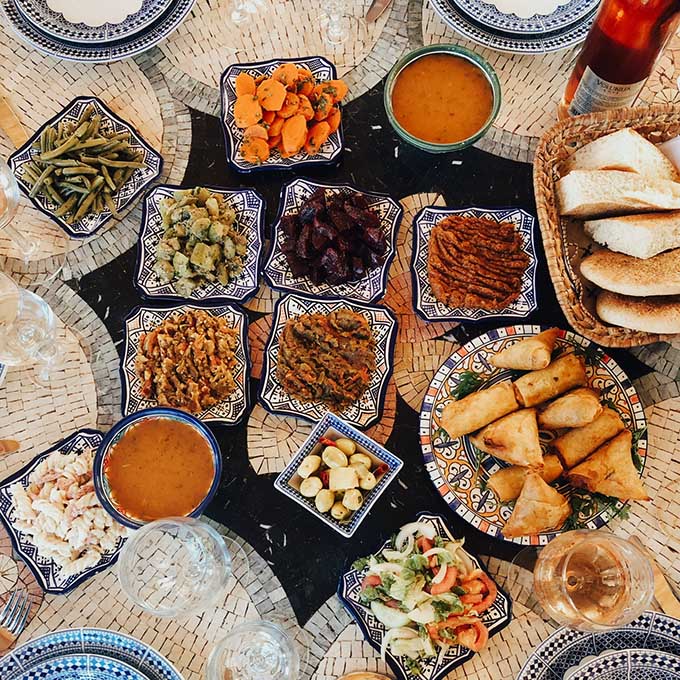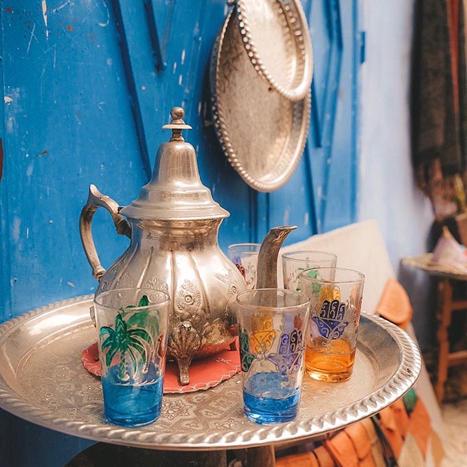 In most Moroccan towns, you are never far from a market and it’s the perfect place to try the local cuisine. A staple meal is tagine—a slow-cooked dish of spiced meat and veg (with occasional vegetarian options), along with a traditional Moroccan mint tea.