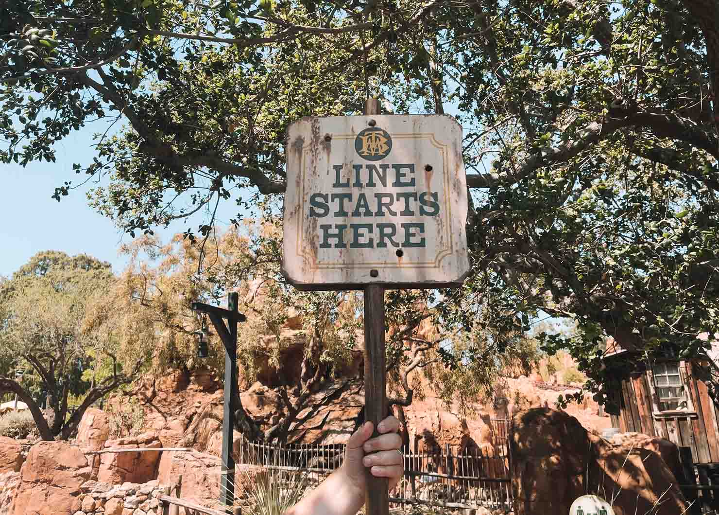 Because queues are redirected to be completely outside, it can be REALLY hard to find the end of the line. Disney Cast Members are holding “Line Starts Here” signs to indicate where a queue begins.