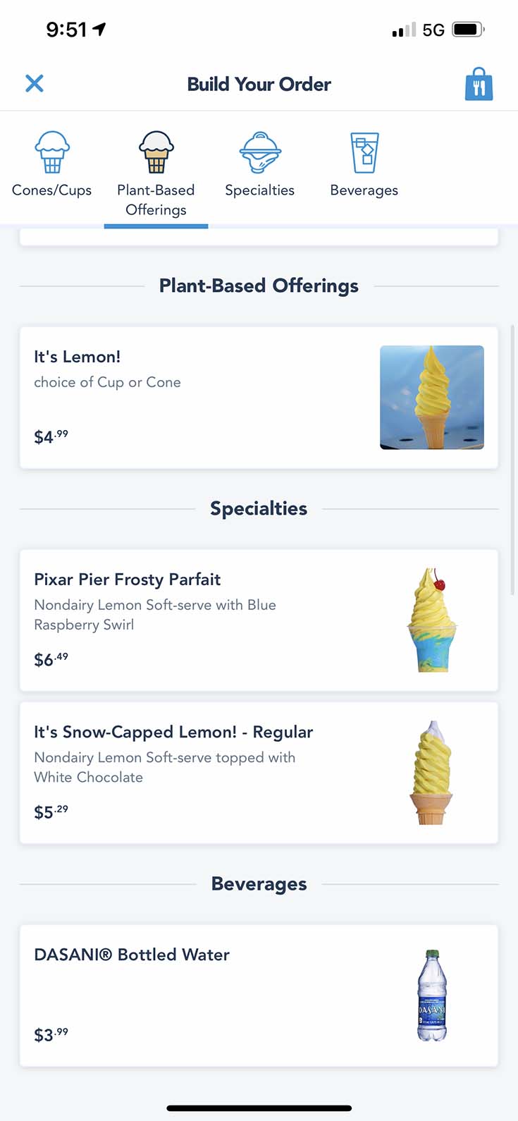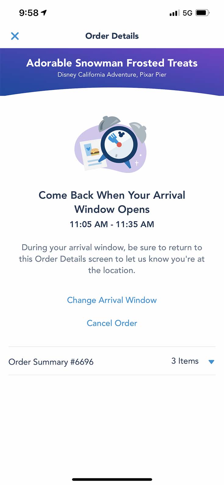 Let’s say you want a hamburger from Tomorrowland — if you go on the app at 11 am, you need to choose your pickup window, which might not be for an hour later.