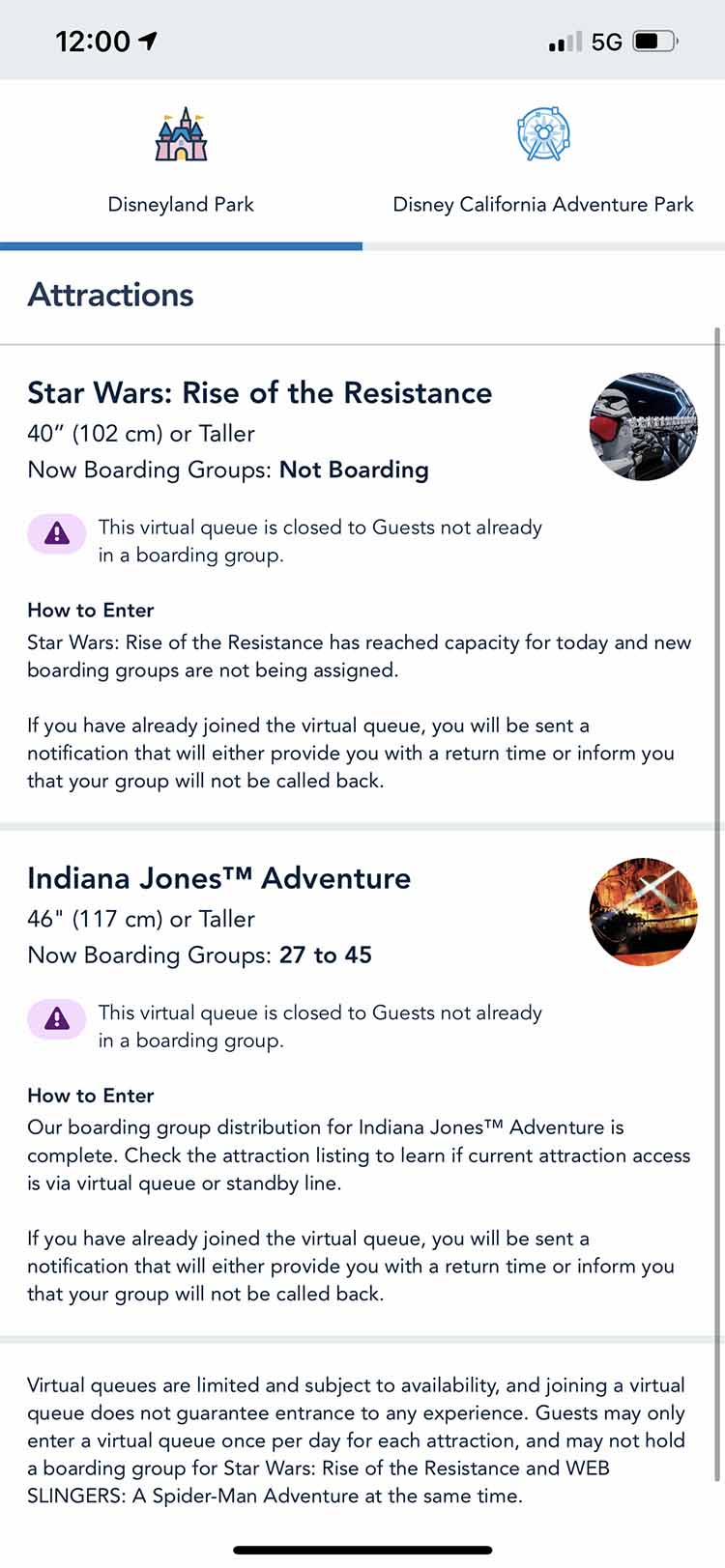 The two rides that require a virtual queue are Star Wars Rise of the Resistance and Indiana Jones. For those going to Disneyland first, you can join a virtual queue for both rides at 7 am and 12 pm. You may or may not get in at 7 am — if you don’t, you can try again at the 12 pm queue opening.