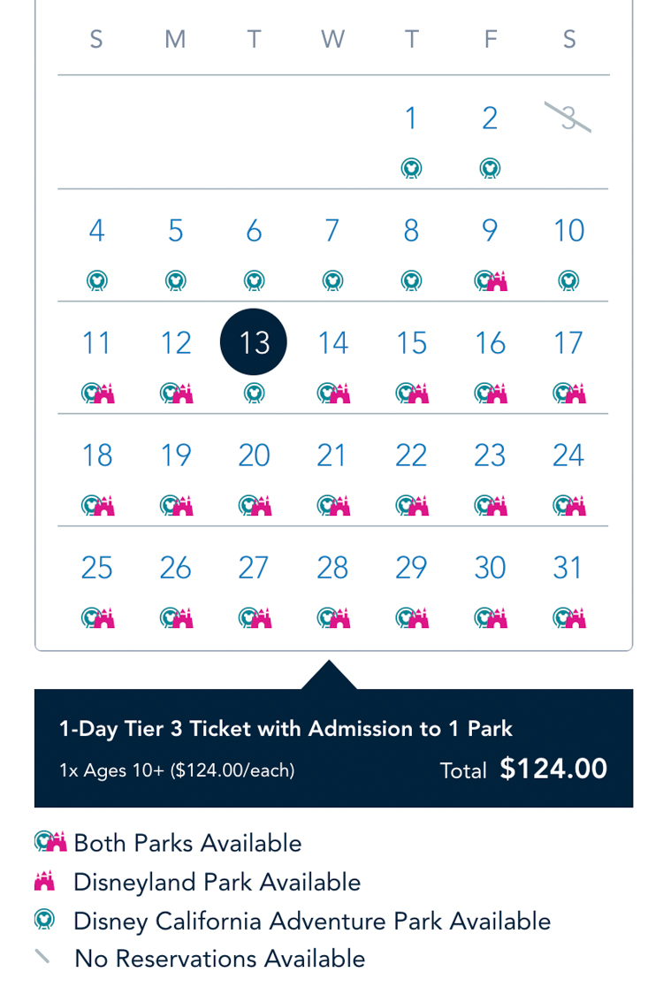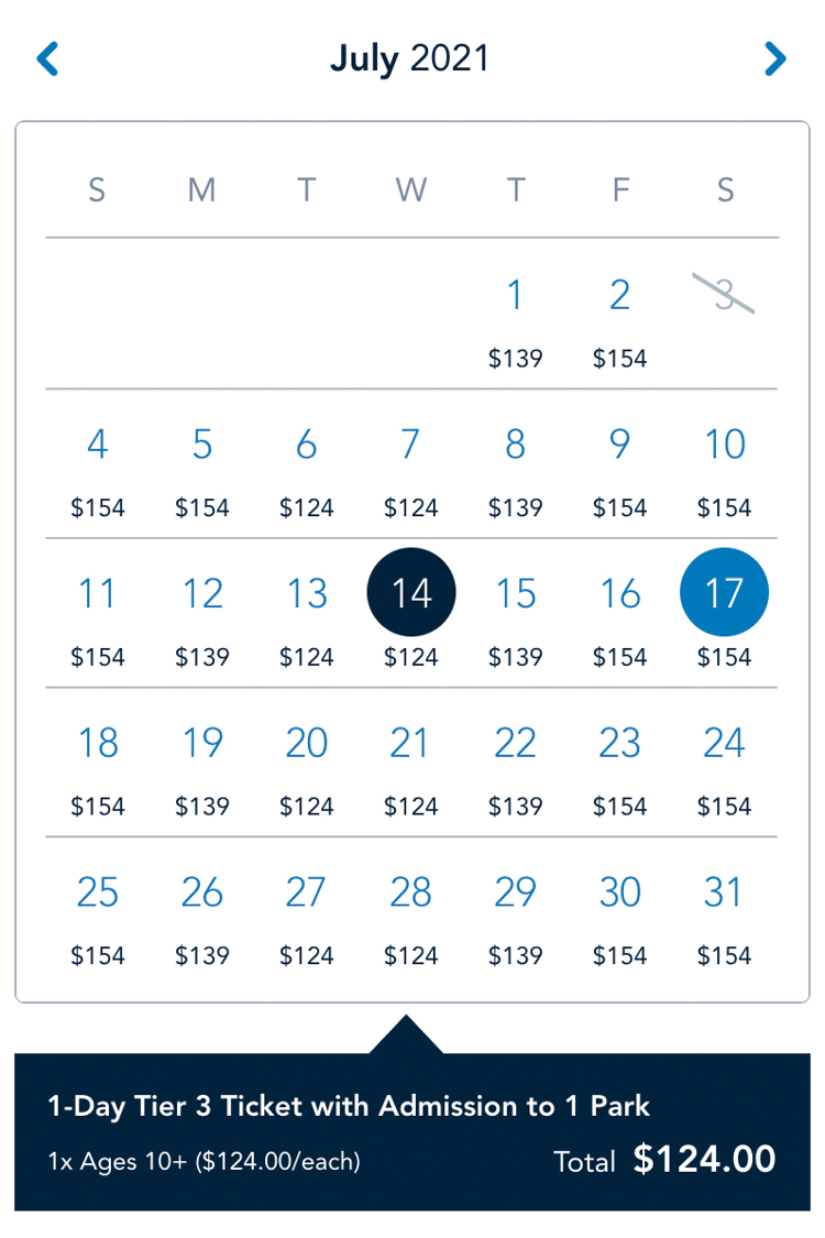 For example, if you want to book a One-Day Disneyland ticket, Tuesday, July 13th is only available for California Adventure. July 14th is Tier 3 for $124 and July 17th is Tier 5 for $154.