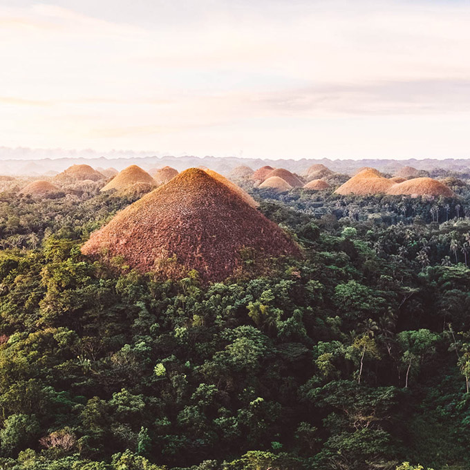 Bohol’s Chocolate Hills come to mind! Located near the town of Carmen, approximately 1,200 symmetrical mounds turn a rich cocoa-brown hue in the dry season, which makes them stand out from the jungle’s lush greenery.
