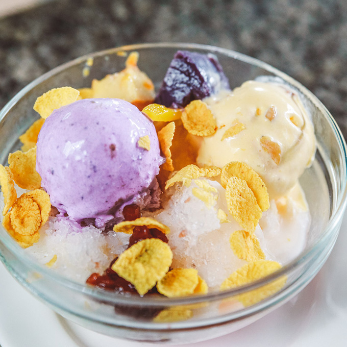 Halo Halo: Meaning “mix-mix” this delicious Filipino dessert is truly a mix of everything! Typically it’s shaved ice, ice cream, and condensed milk, topped with whatever fruits and sweet treats are available like mango, jellies, corn flakes, coconut, or sweetened red beans.