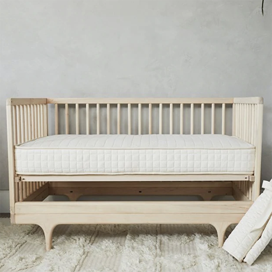 This mattress is a GOTS (Global Organic Textile) certified organic hybrid crib mattress and has a two-stage flippable design. Intended for use from newborn to one year, the infant side provides support while the toddler side has a bit more plush for when they move and fidget during the night.