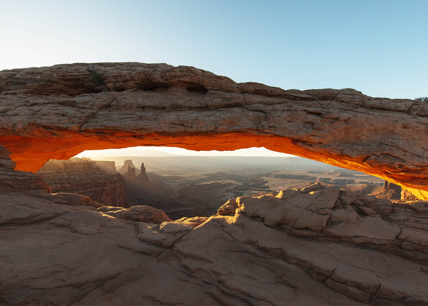 As the sun rises behind Mesa Arch, the bottom of the arch will illuminate, as if on fire.