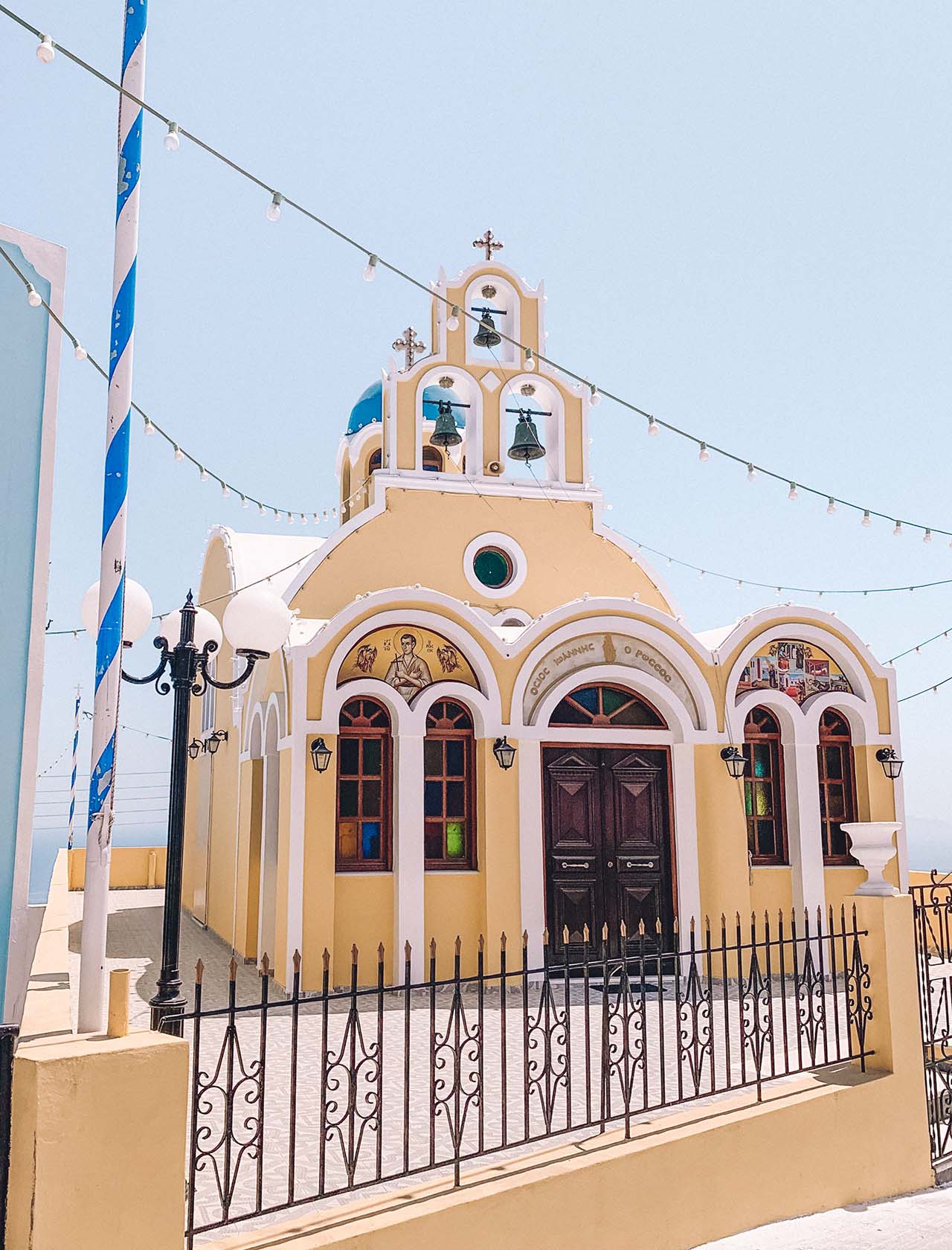 You can reach the churches via a steep path which offers views of the Santorini caldera. Also in the area of the hike to the cliff churches is this darling yellow church, too.