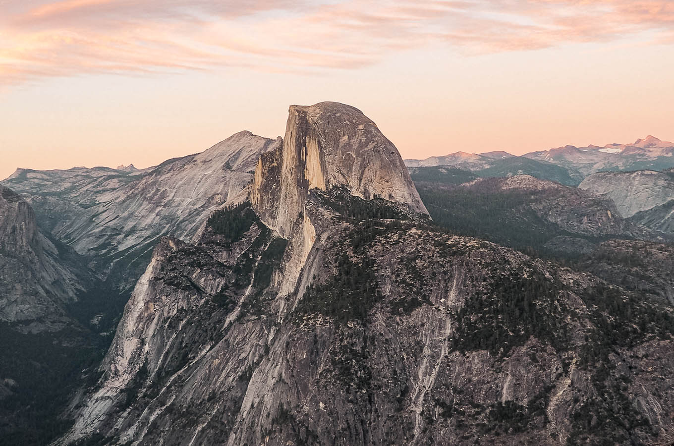 For a romantic ending of the day, drive up to Glacier Point to see the iconic Half Dome shining in the orange and red lights of the sunset.