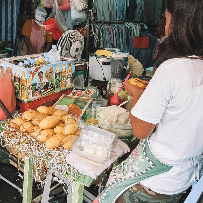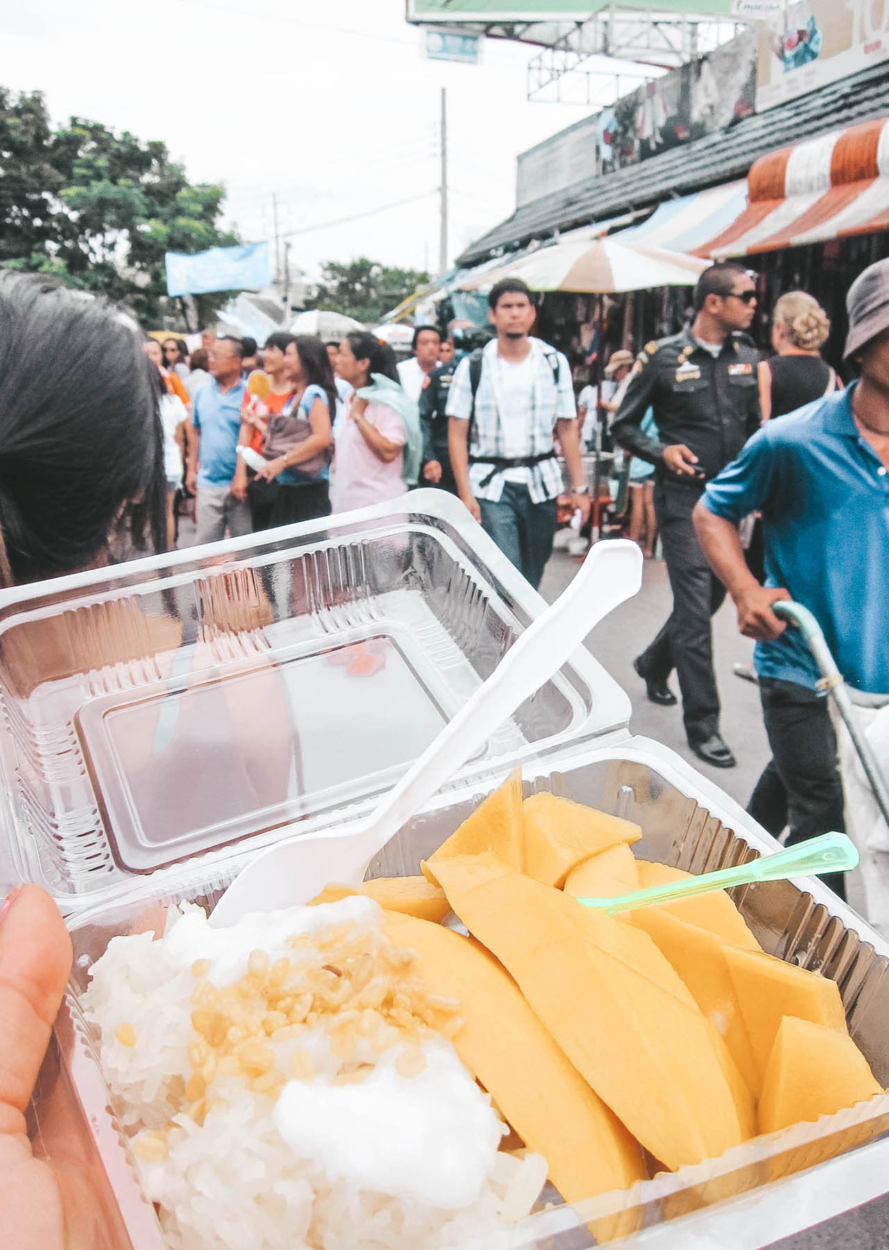 Anything you could possibly think of is sold at this market. So, if you wanna bring home a little somethin’ somethin’, definitely plan on coming here. I grabbed some mango and sticky rice, put on my game face, and got to work.